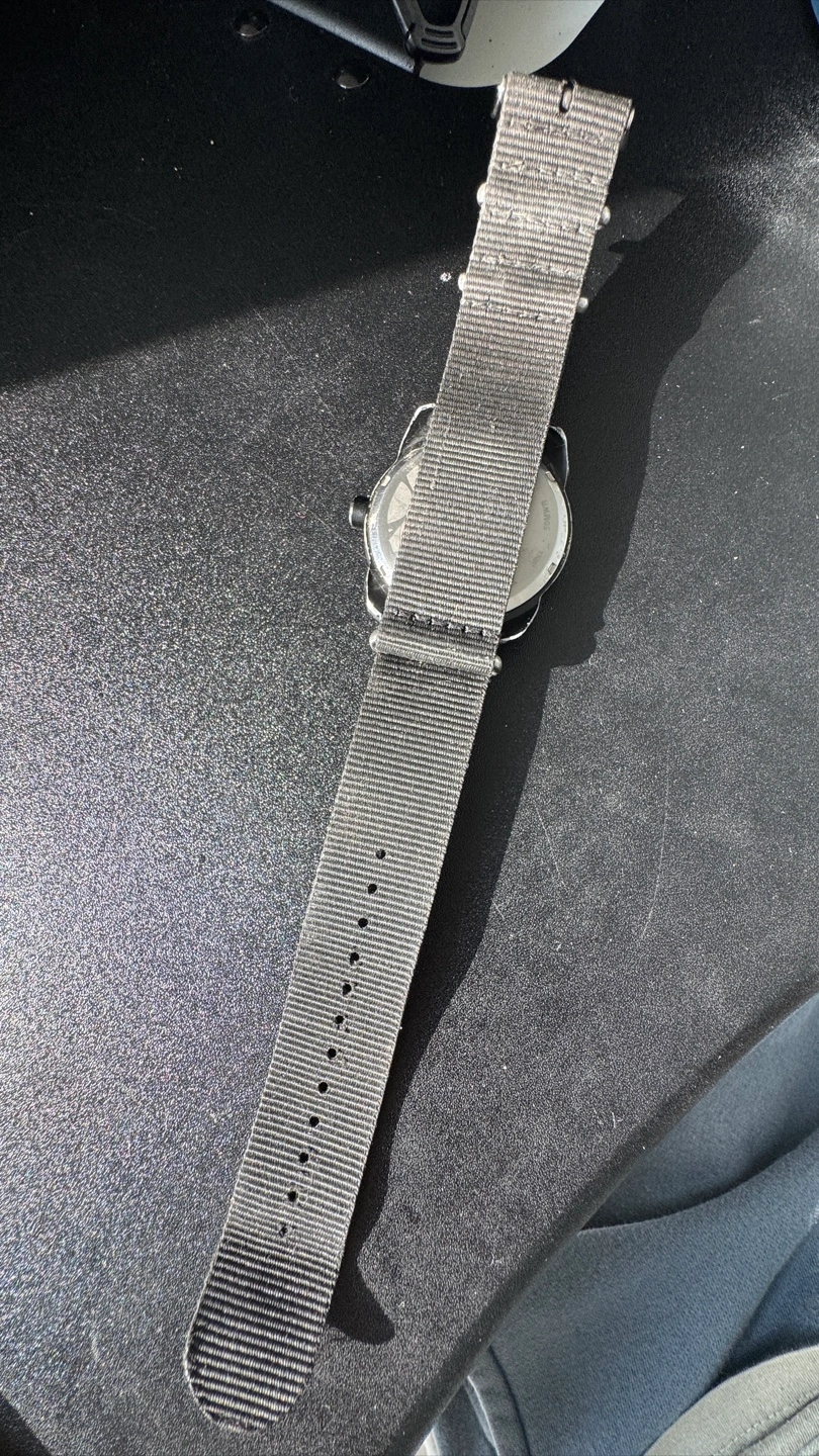 Selling a watch with a unique blue face and a grey nylon strap. It has a cool, retro look. The watch shows some signs of wear, adding to its vintage charm. Perfect for someone who appreciates classic timepieces!