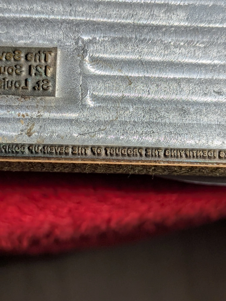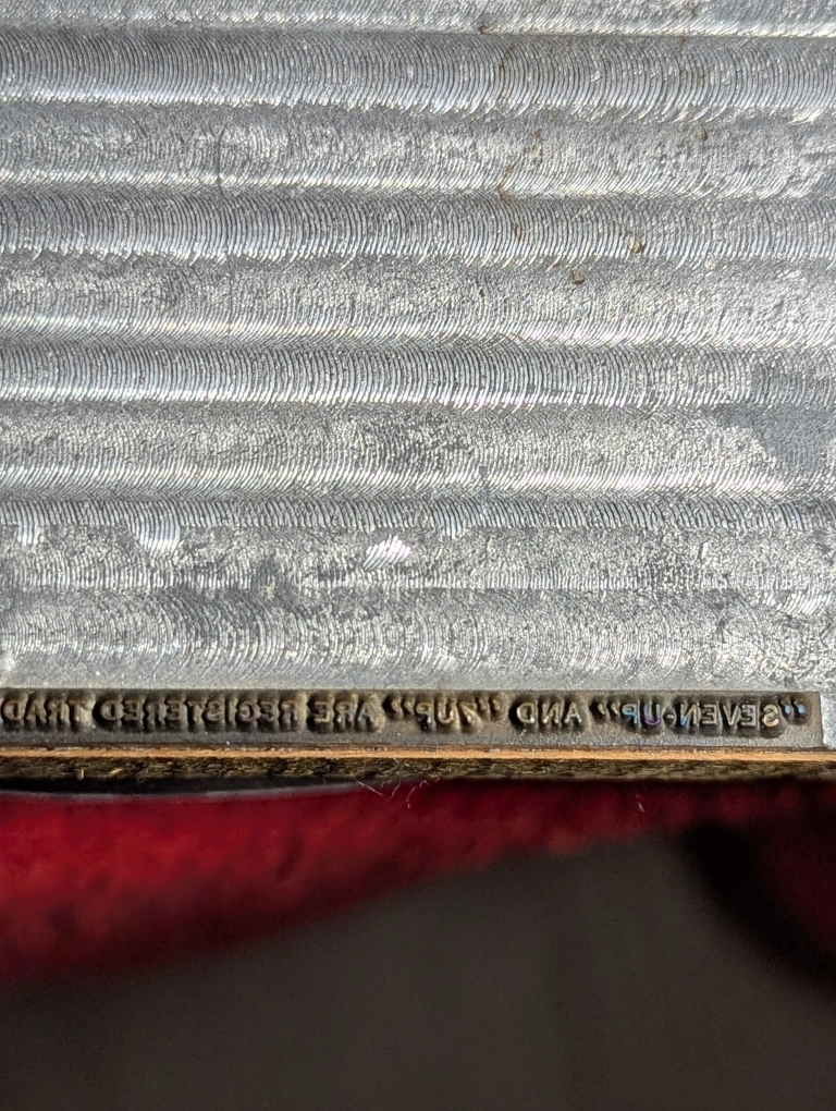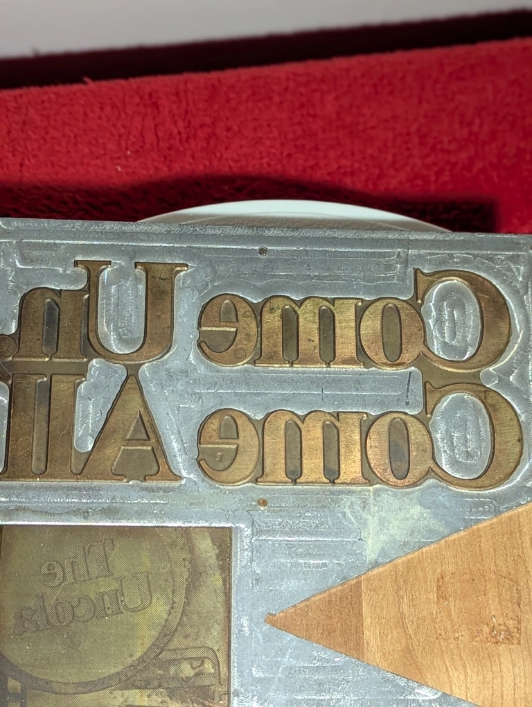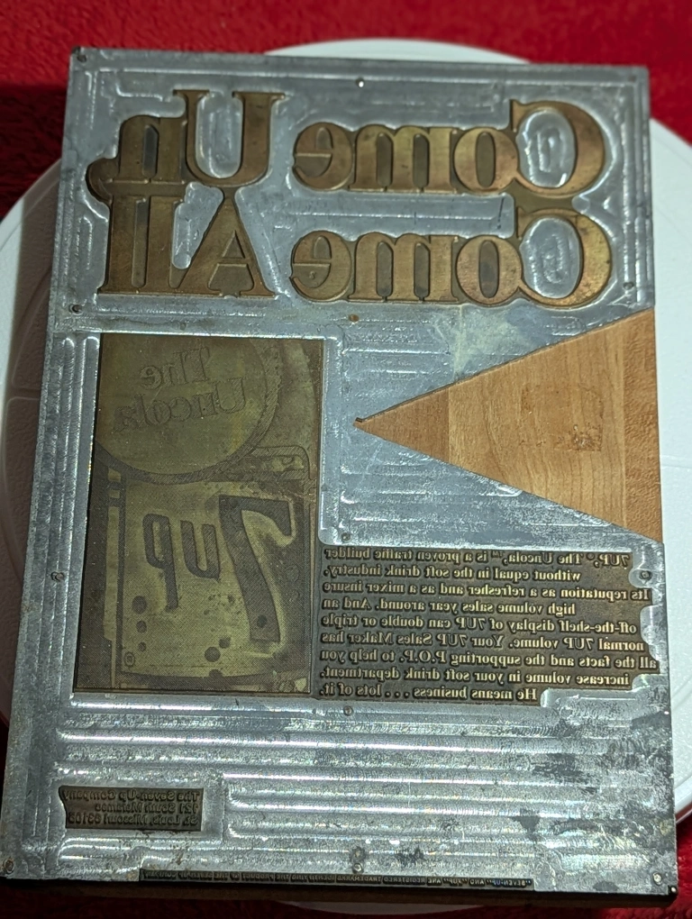 Selling a vintage printing plate featuring the 7-Up logo and the phrase "Come Up Come All". This piece is from The Seven-Up Company, located at 121 South Meramec, St. Louis, Missouri 63105. It's a unique item for collectors or those interested in vintage advertising memorabilia. Plate is on heavy hardwood. 11 x 7 inches. Unusual item.