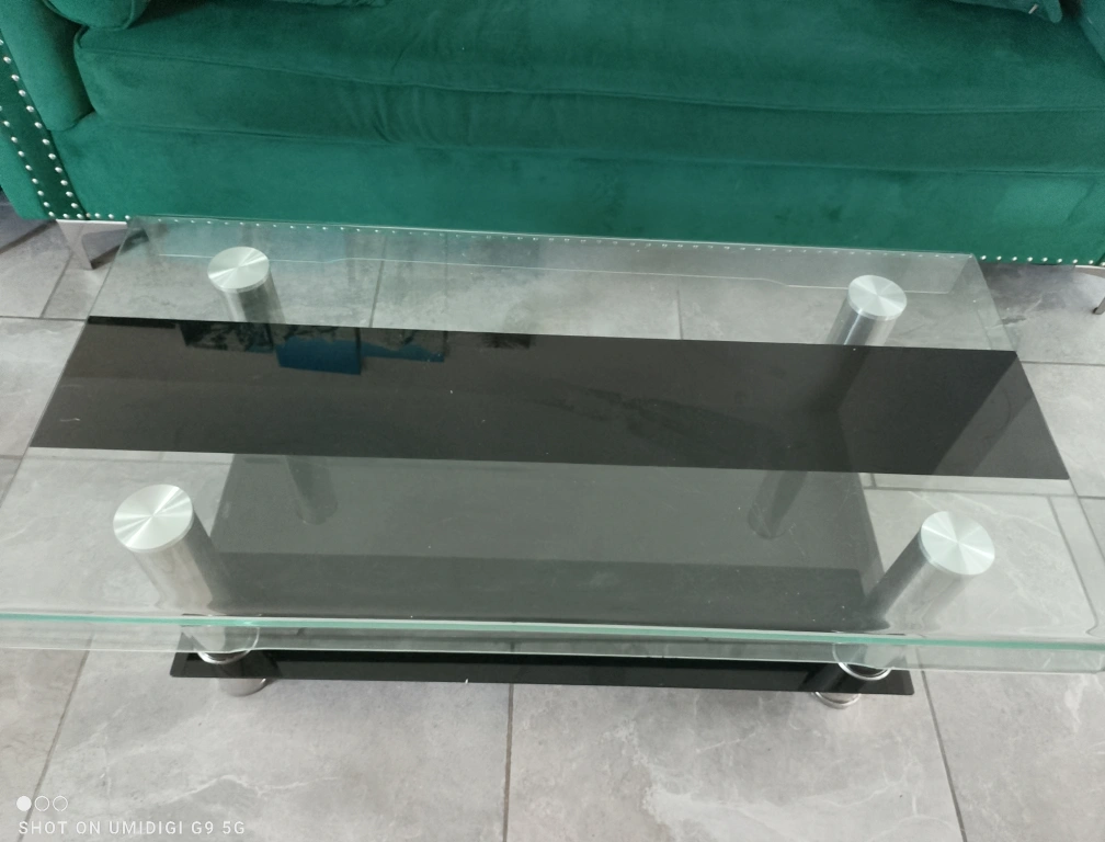Selling a coffee table with a glass top and a black stripe in the middle! It has silver legs and is in good condition