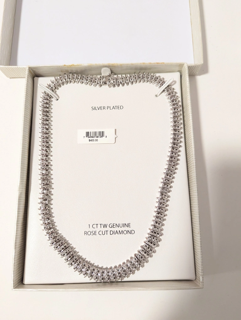 This is a beautiful silver plated necklace with 1 CT TW genuine rose cut diamonds. It comes in its original box. by Victoria Townsend pick up near Birchmount/Ellesmere. cash only.