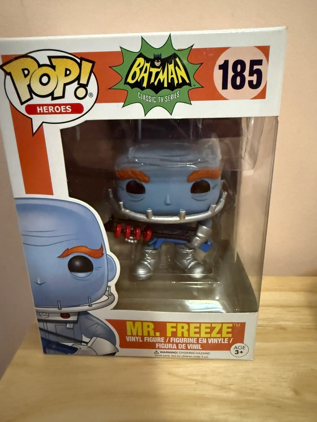 Selling a Funko Pop! Heroes figure of Mr. Freeze from the classic Batman TV series. It's number 185 in the series and comes in its original box. The figure is a vinyl collectible and is recommended for ages 3+