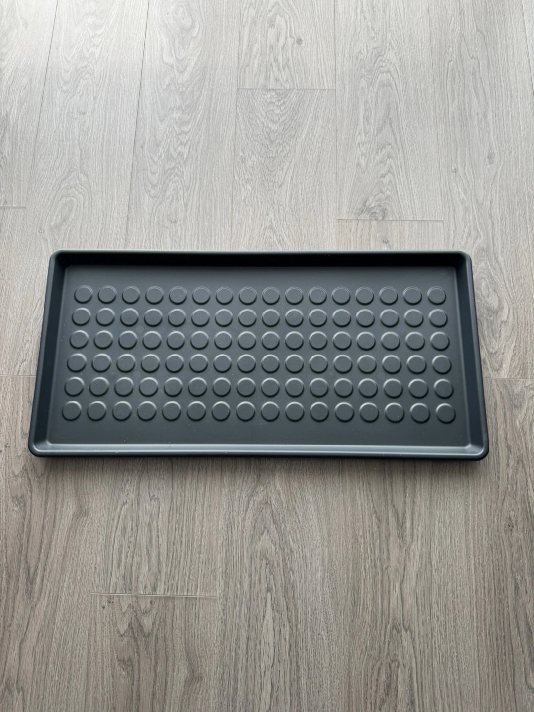 This gently-used and nice-looking shoe tray protects your floor from dirt. The high edge makes sure that dirt and water stay on the tray. It can hold three pairs of winter boots.