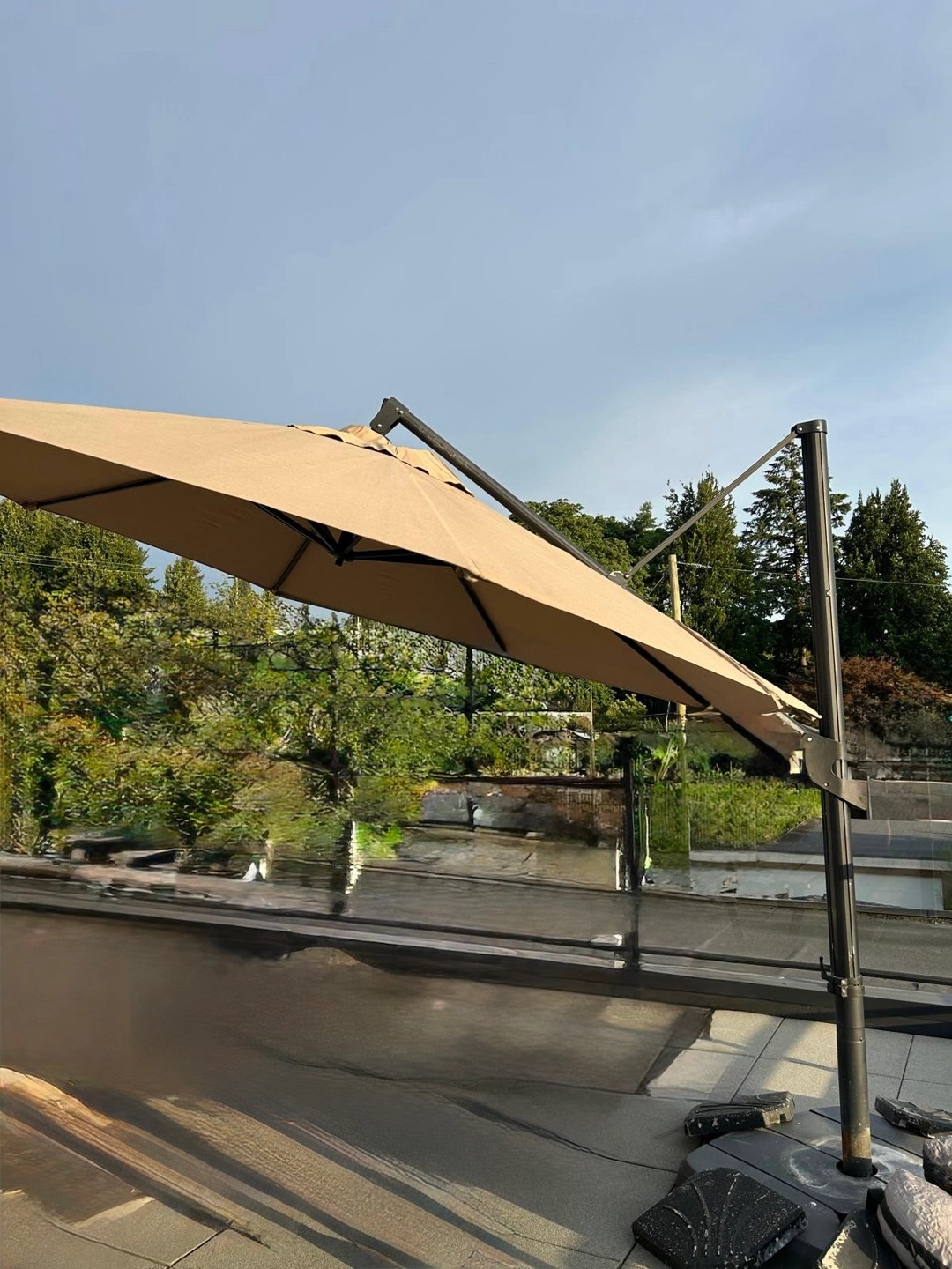 Selling a beautiful sturdy cantilever patio umbrella in beige. It's in great condition and ready to provide shade for your outdoor space. Includes extra weights for the base. Moves up and down and tilts.