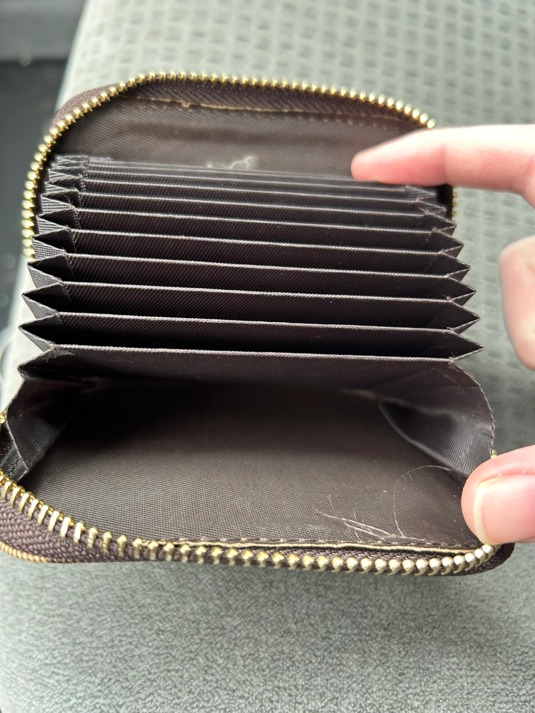 Here's a card holder wallet with a brown plaid design! It's in great condition and ready for a new home