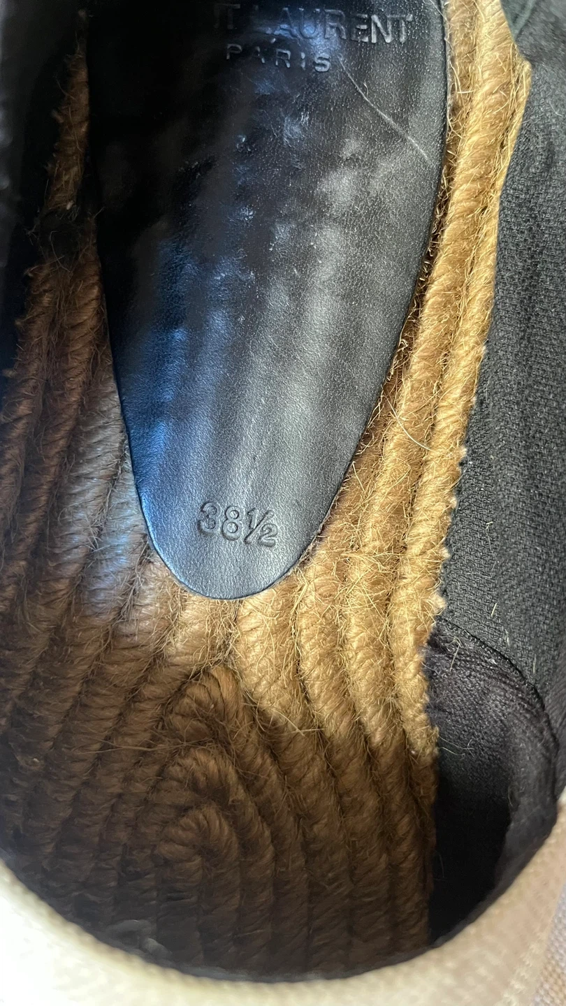 Saint Laurent canvas espadrilles, size 38.5. These stylish slip-ons feature the iconic Saint Laurent logo, adding a touch of luxury to a classic design. The jute soles provide comfort and durability, perfect for everyday wear. These espadrilles are in good condition, showing minor signs of wear.