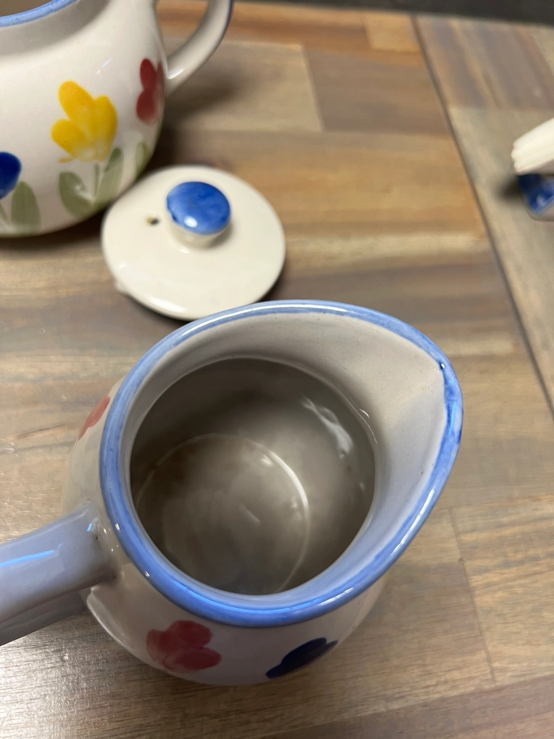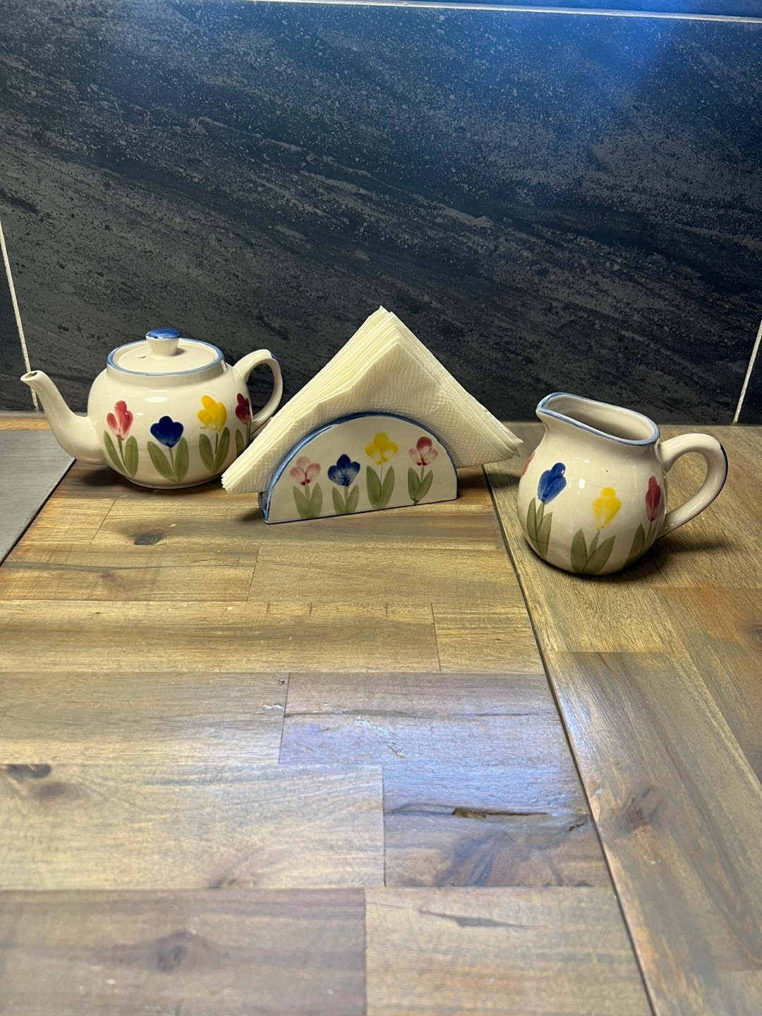 Cute floral teapot, creamer, and napkin holder set. Perfect for adding a touch of spring to your kitchen or dining room. The teapot is a good size for afternoon tea, and the creamer is perfect for serving with coffee or tea. The napkin holder completes the set! Coffee mug is shown next to creamer for size approximately. No cracks, breaks, or wear. PICK UP LOCATION: Marlborough.
