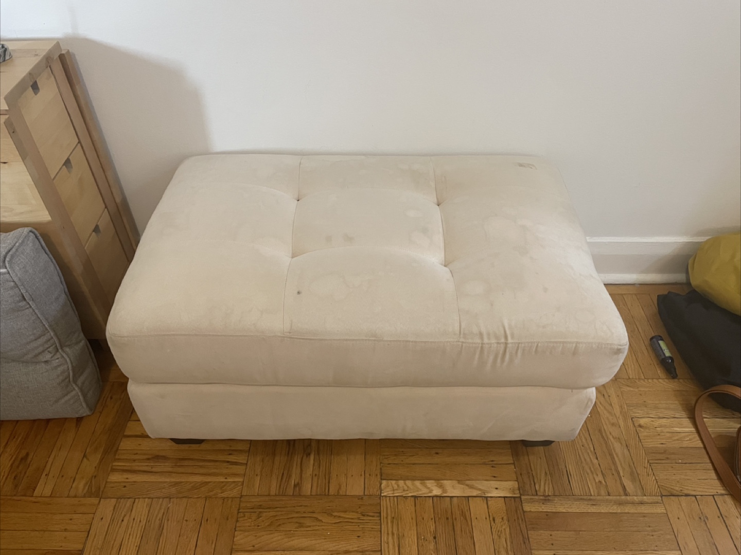 got it used in 2021, it came with light staining and it has been periodically steam cleaned & always covered with a blanket since i bought it. it does not have a storage compartment!