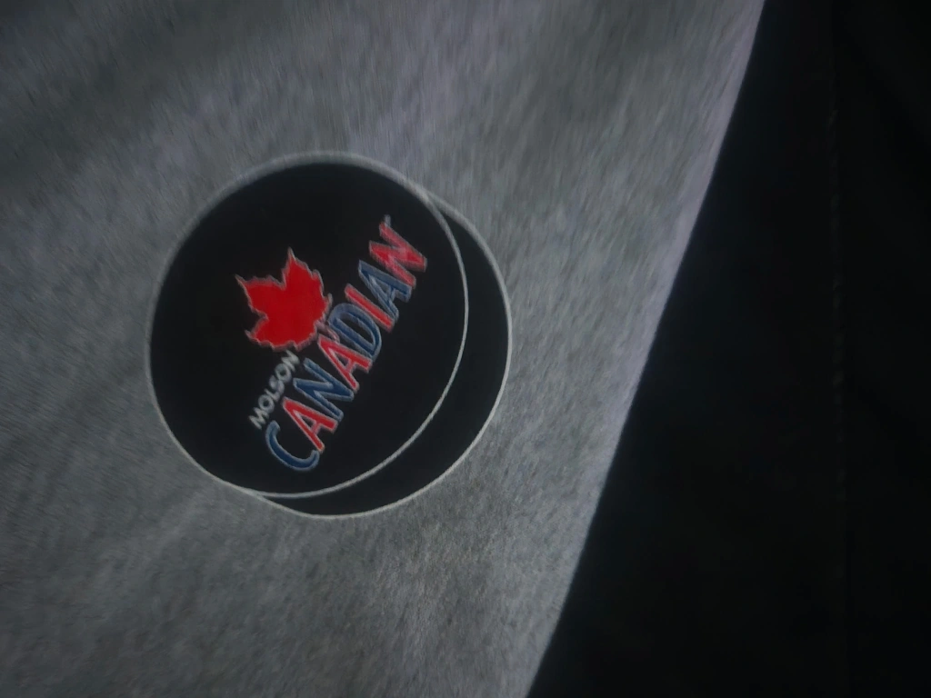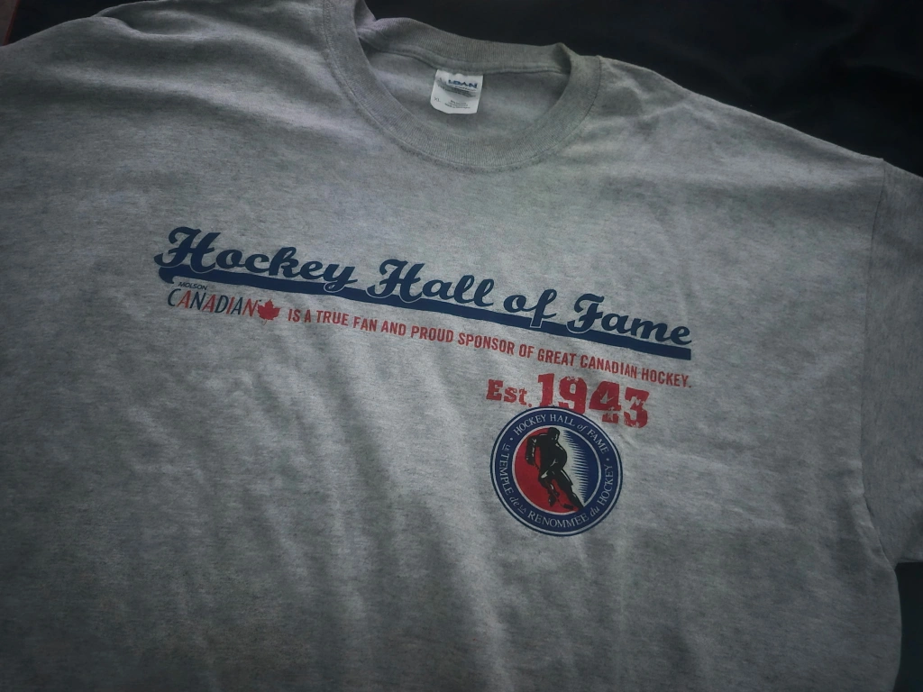 Gildan T-shirt featuring the Hockey Hall of Fame logo and Molson Canadian branding. It's a grey tee with red and blue accents, perfect for any hockey fan!