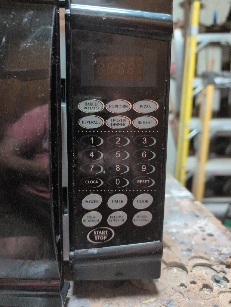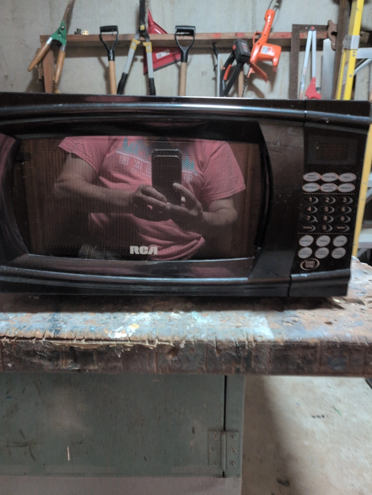 Selling a black RCA microwave. It has settings for baked potato, popcorn, pizza, beverage, frozen dinner, and reheat. There are also options for cook by weight, defrost by weight, and speed defrost