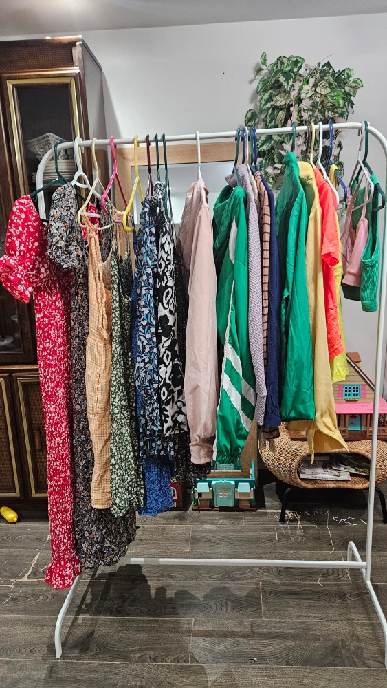 A selection of women's clothing items including tops, dresses, and outerwear in various colours and styles. Brands include Forever 21, american eagle ,shein ,old navy ,Adidas, h&m,Lululemon. Perfect for refreshing your wardrobe!