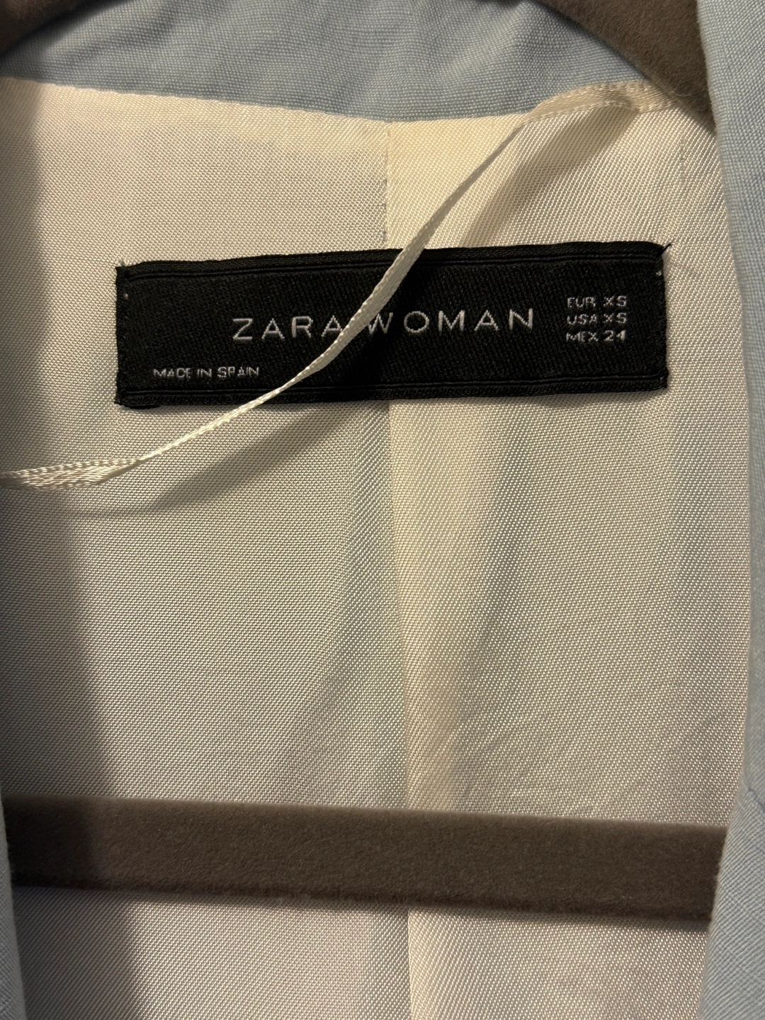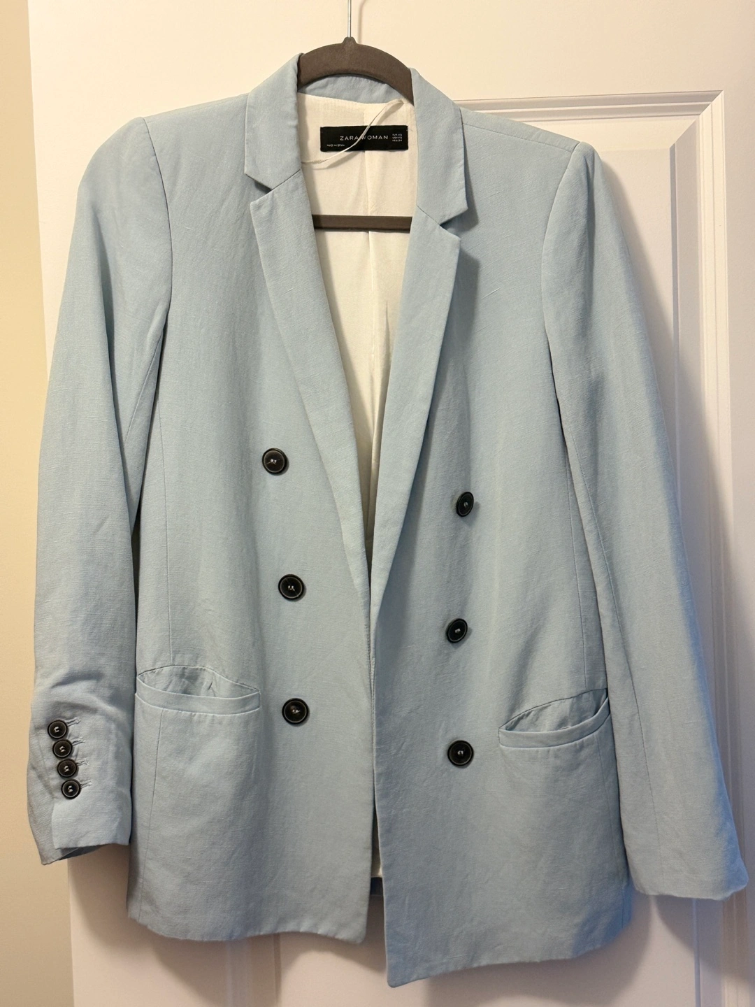 Here's a Zara Woman blazer in a lovely light blue colour! It's a size XS and features a double-breasted design with black buttons. Perfect for adding a touch of sophistication to any outfit