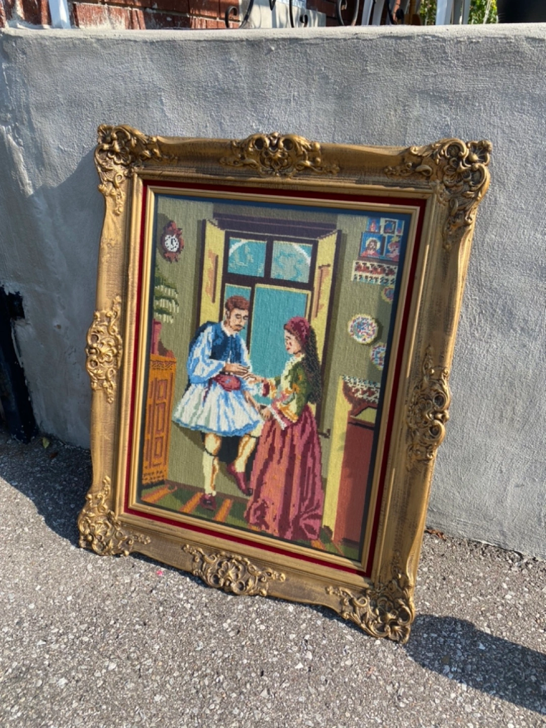 Beautiful framed needlepoint art. Great condition. The frame is a detailed gold colour and the art itself depicts a (Greek) couple indoors.