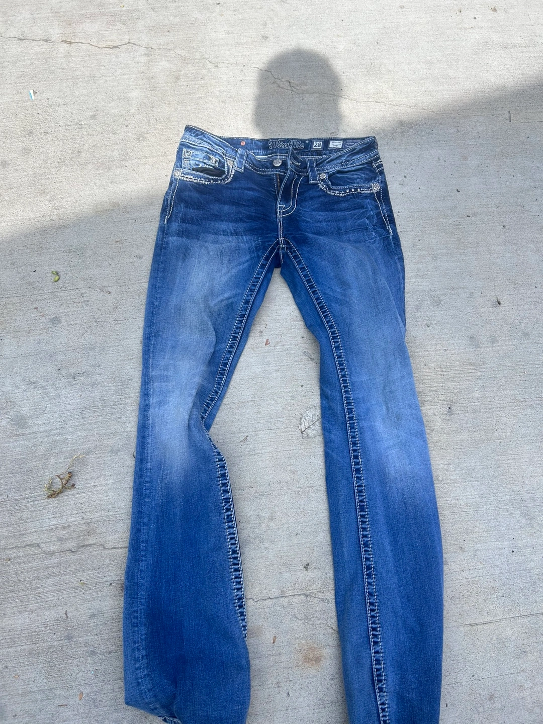 Selling a pair of Miss Me jeans in size 28. They're in good condition and have a stylish design on the pockets.