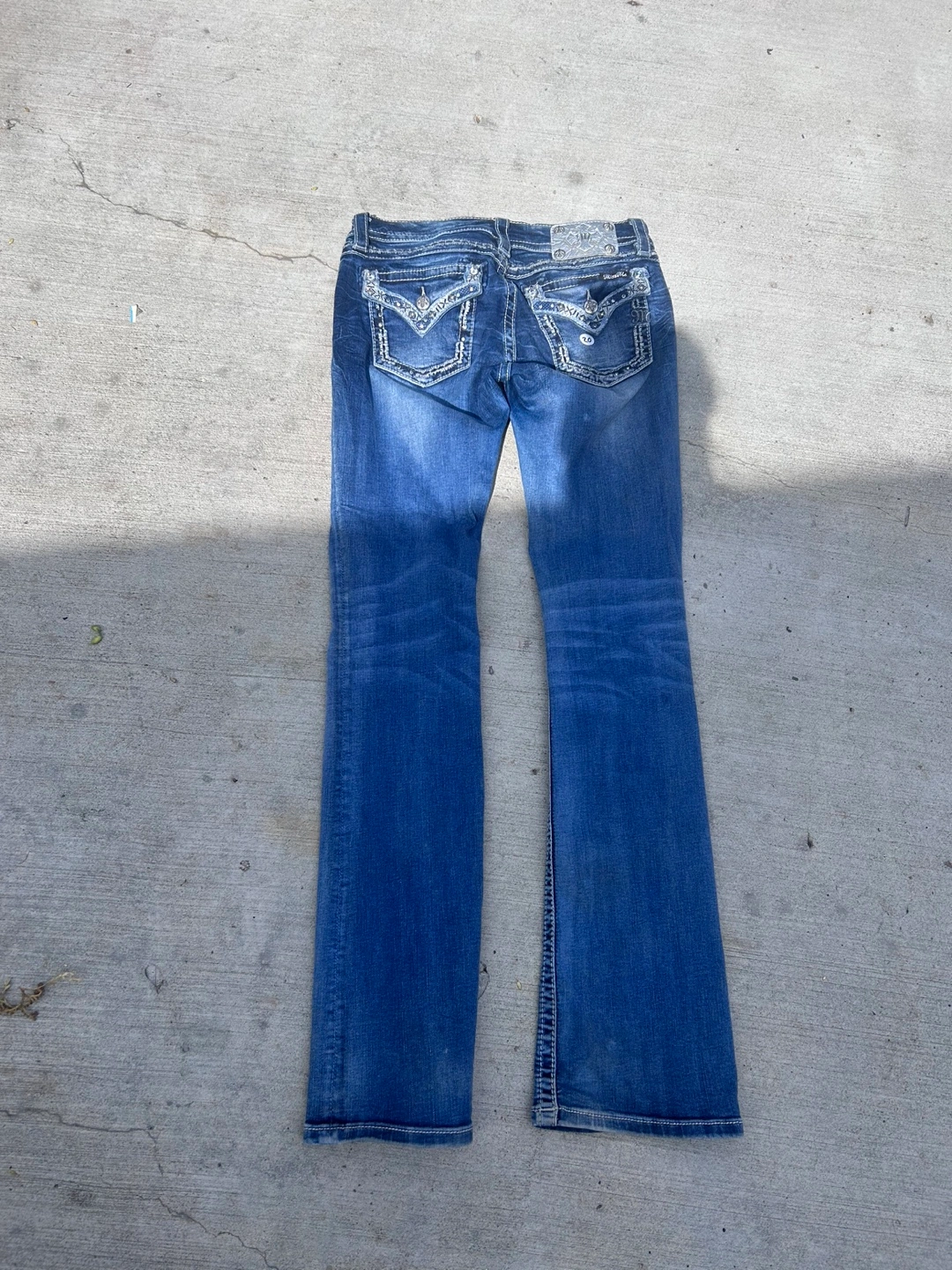 Selling a pair of Miss Me jeans in size 28. They're in good condition and have a stylish design on the pockets.
