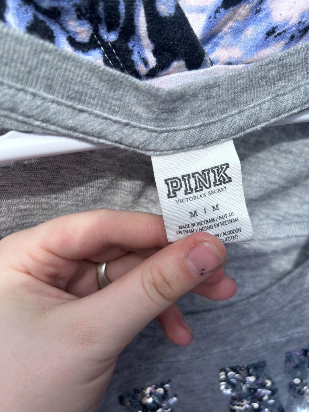 Selling a Victoria's Secret PINK long-sleeve shirt in size medium. It's a comfy grey colour with some silver detailing on the sleeves and front.
