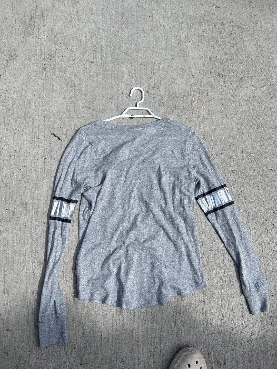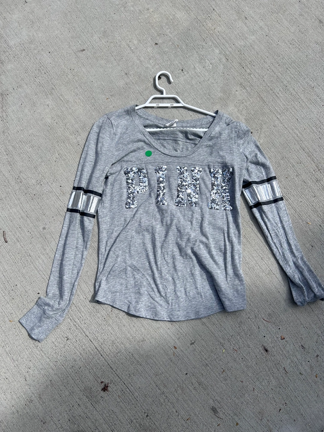 Selling a Victoria's Secret PINK long-sleeve shirt in size medium. It's a comfy grey colour with some silver detailing on the sleeves and front.