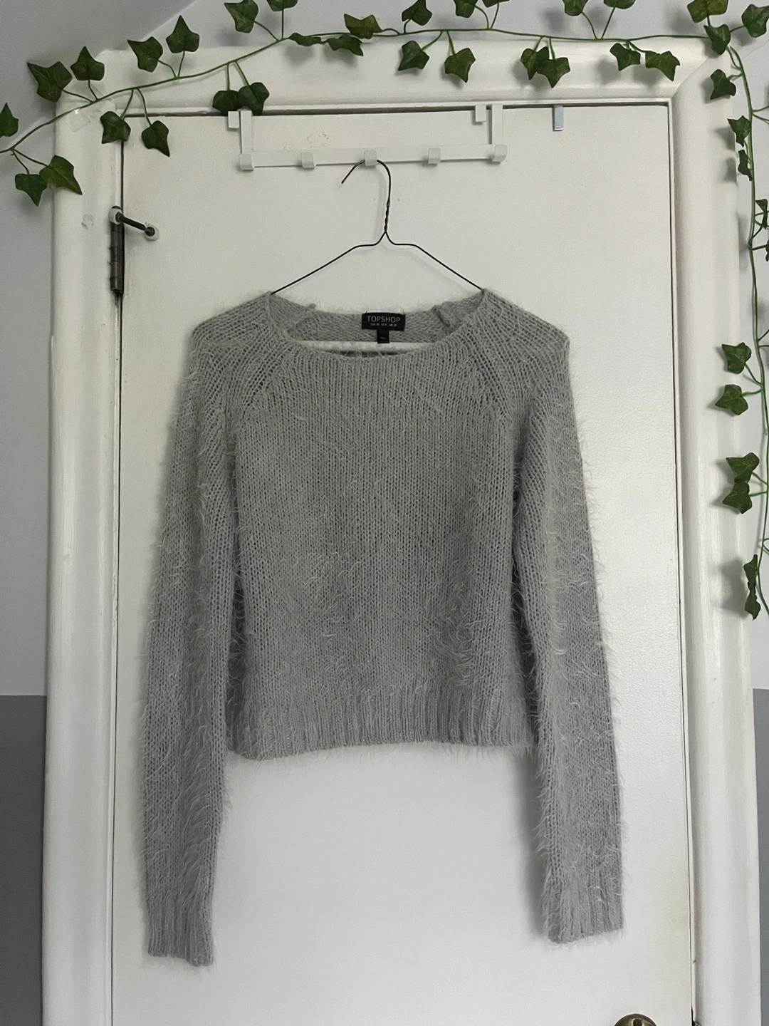 Cozy up in this lovely grey knit fuzzy sweater from Topshop! It's a size US 6 (EUR 38, UK 10) and fits similar to XS- fitted M. Super soft and comfortable, classic piece for a fall wardrobe!