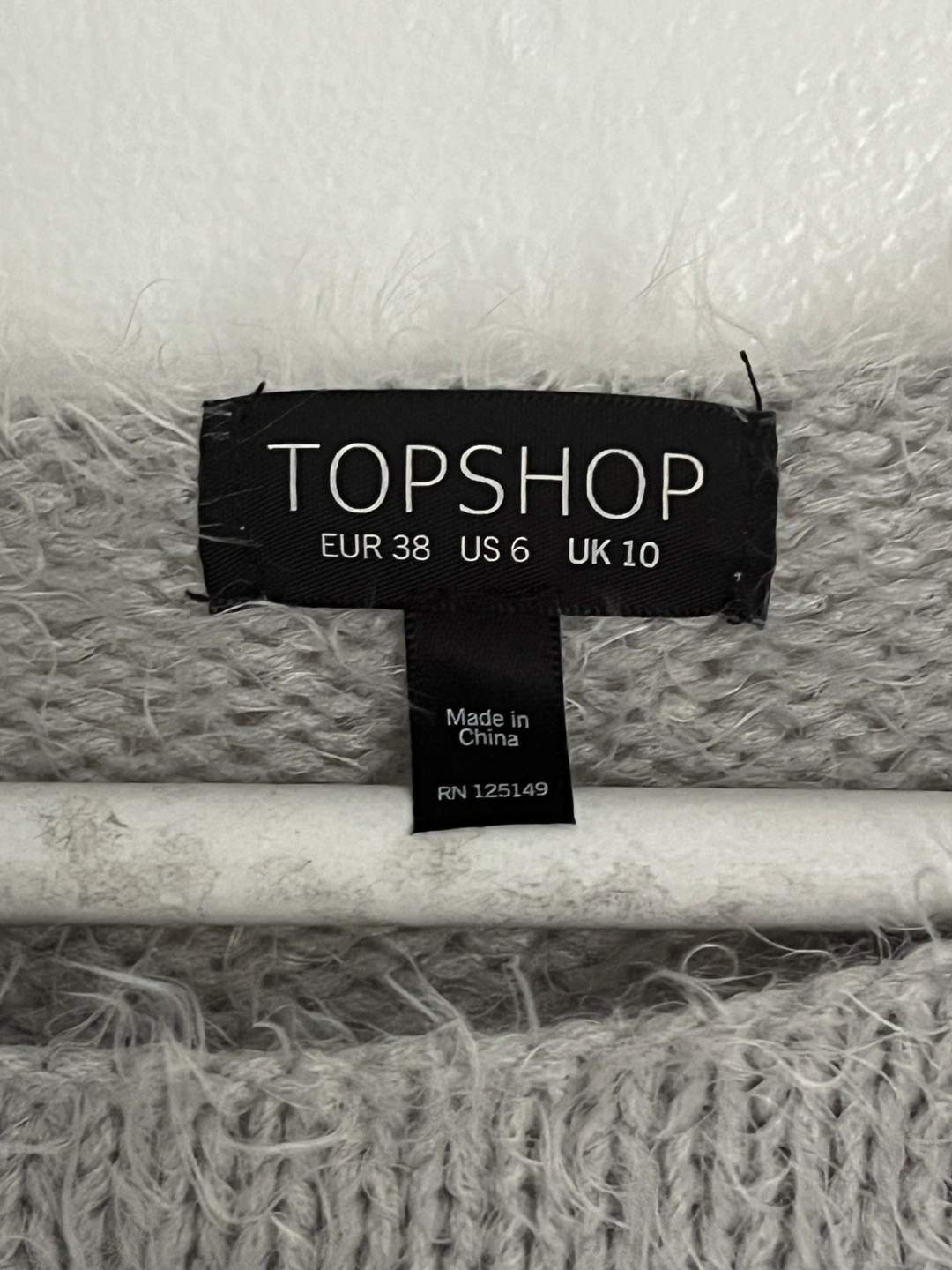 Cozy up in this lovely grey knit fuzzy sweater from Topshop! It's a size US 6 (EUR 38, UK 10) and fits similar to XS- fitted M. Super soft and comfortable, classic piece for a fall wardrobe!