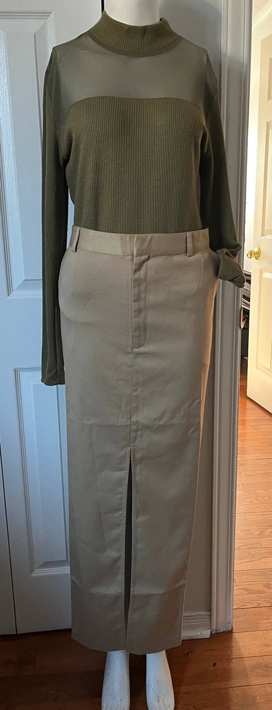 This is a stylish beige maxi skirt from The Drop, perfect for adding a touch of elegance to your wardrobe. It's a size large and features a flattering silhouette. Has 4 pockets. The material is a blend of 64%, viscose, 34% 4% polyester and 2% elastane, offering both comfort and durability