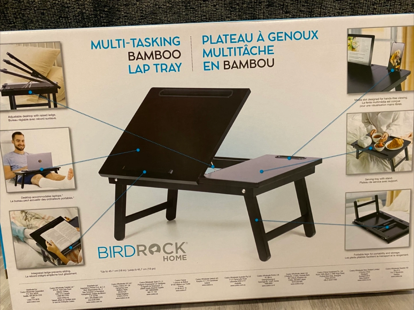 Looking to sell a multi-tasking bamboo lap tray by BirdRock Home! This lap tray features an adjustable desktop with a raised ledge, perfect for using laptops or tablets comfortably. It also has an integrated ledge to prevent sliding and foldable legs for easy portability and storage. The dimensions are up to 45.7 cm (18 in).