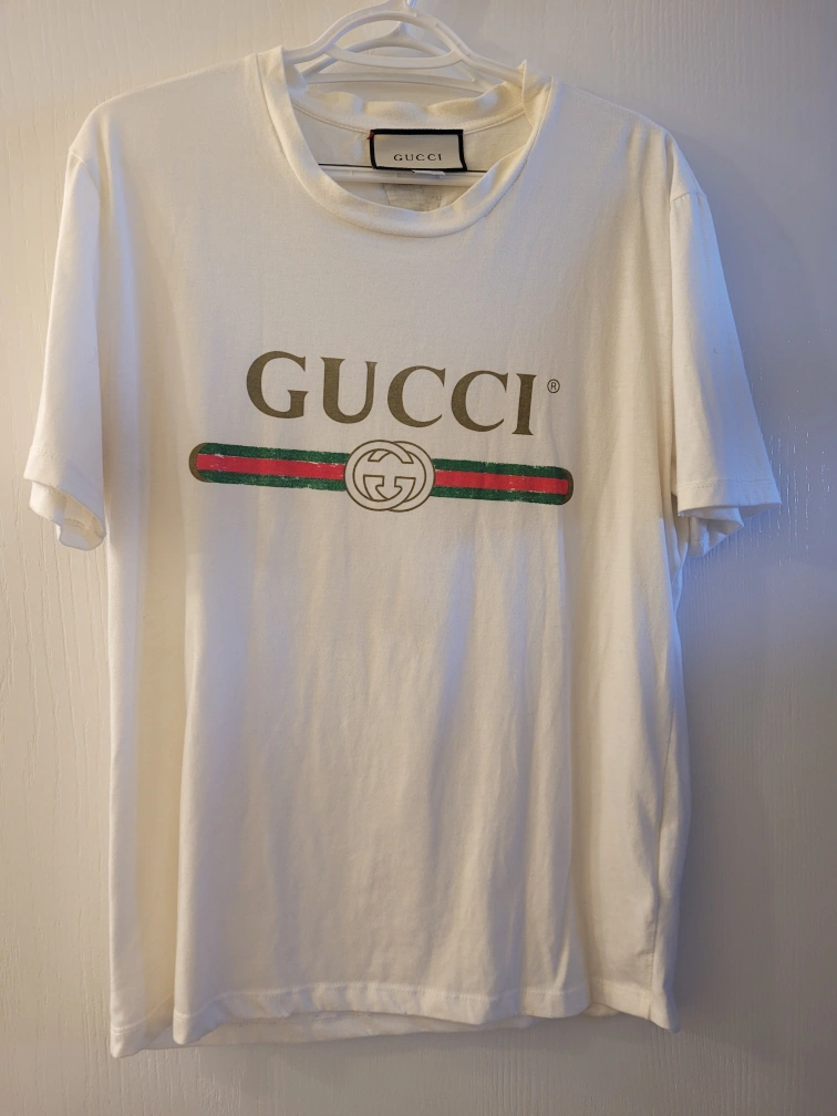 Selling a Gucci white cotton T-shirt. It's in great condition. Made in Italy, this stylish tee features the iconic Gucci logo. Perfect for adding a touch of luxury to your casual wardrobe!