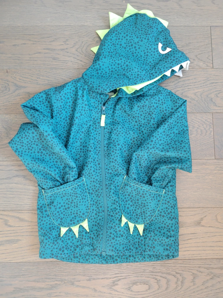 Super cute dinosaur-themed rain jacket for kids! It features a fun design with dinosaur spikes on the hood and pockets. Perfect for keeping your little one dry and stylish on rainy days