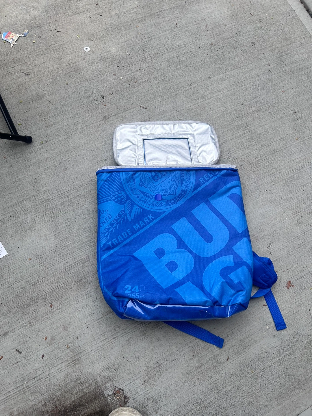 Keep your drinks cool on the go with this Bud Light backpack cooler! It's a vibrant blue and features the Bud Light logo. Perfect for picnics, BBQs, or any outdoor adventure. It can hold up to 24 cans and has adjustable straps for easy carrying