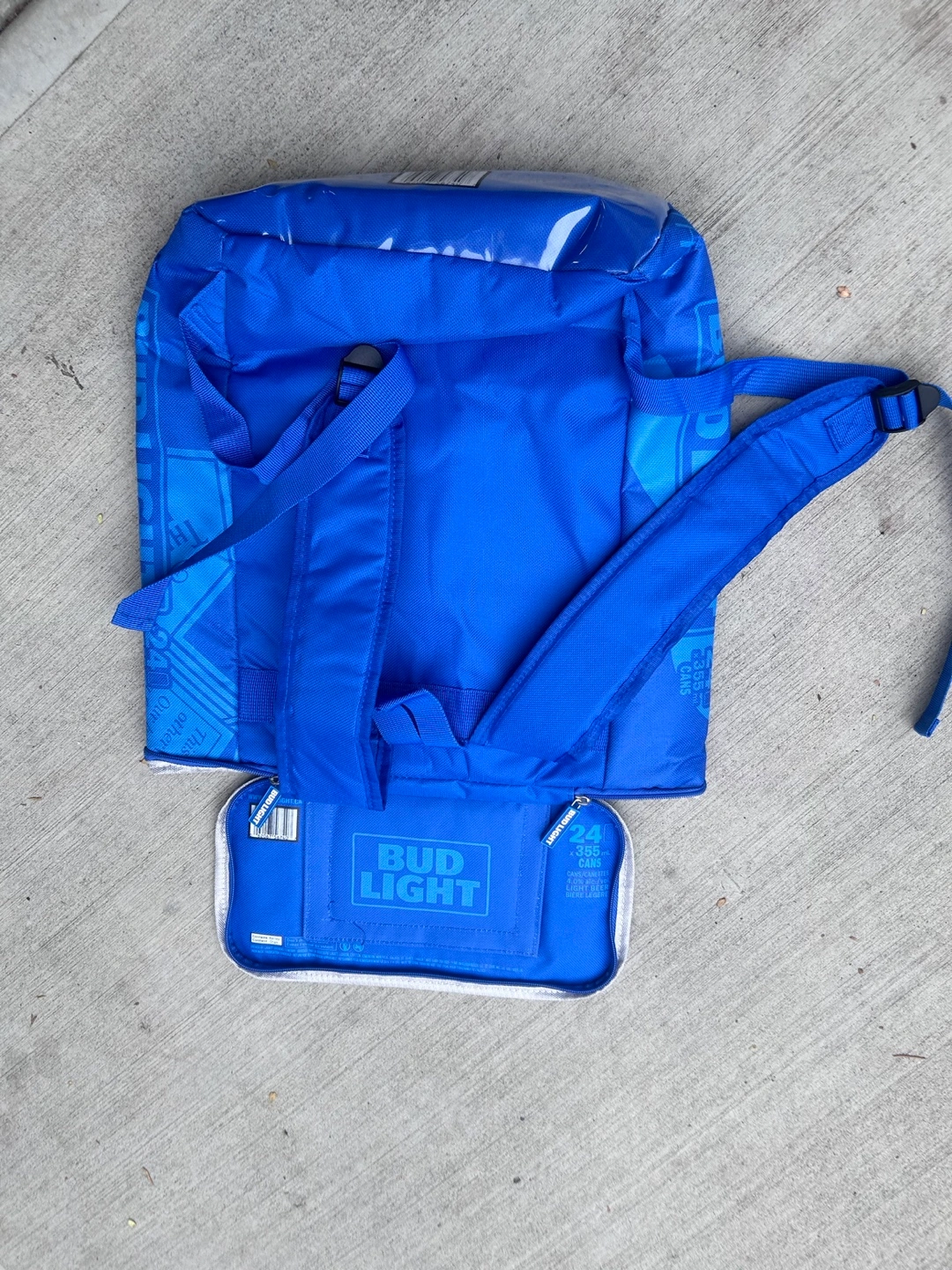 Keep your drinks cool on the go with this Bud Light backpack cooler! It's a vibrant blue and features the Bud Light logo. Perfect for picnics, BBQs, or any outdoor adventure. It can hold up to 24 cans and has adjustable straps for easy carrying