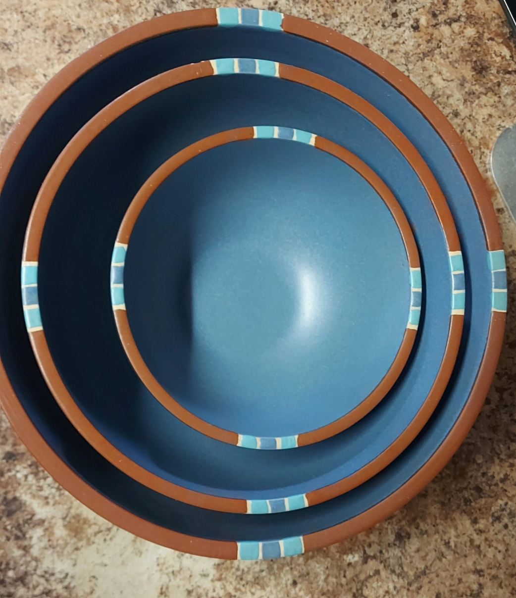 Here's a set of three decorative bowls! They are in great condition and would look lovely in any home. They nest inside each other for easy storage, too