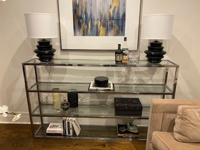 Stylish vintage 4-tier console table with a chrome metal frame and removable glass shelves. Originally purchased from Zig Zag in Leslieville – known for curated vintage finds.