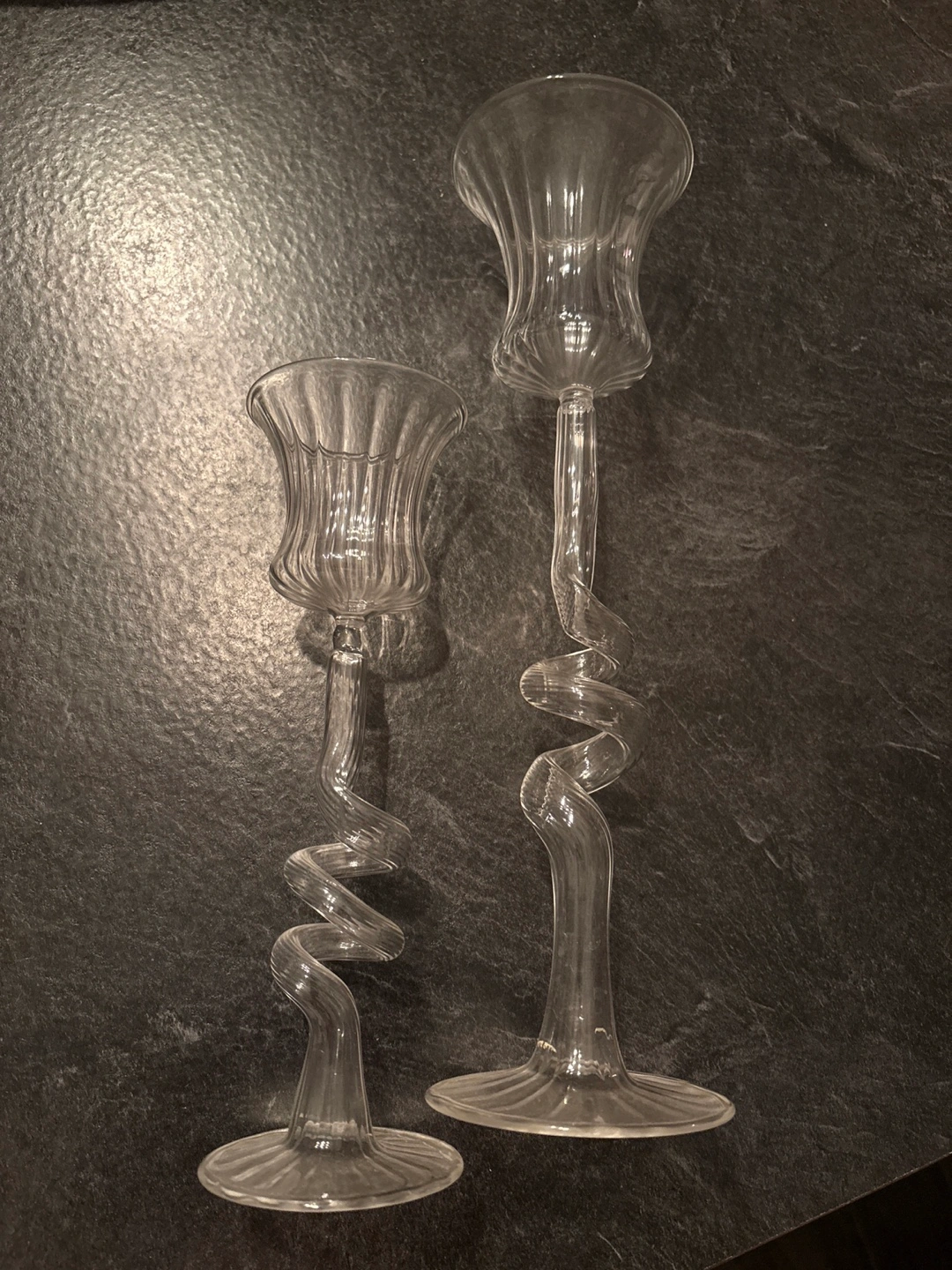 Selling a set of two elegant and very delicate glass candle holders. They feature a unique spiral design and would be a lovely addition to any home decor