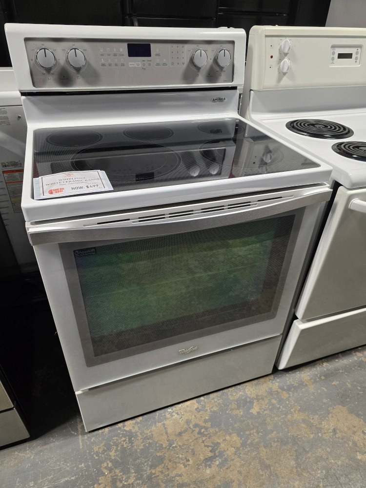 Selling a Whirlpool white electric range. It is in good condition and ready for a new home. It has a glass top and a self-cleaning oven. The range is white and has a digital display.