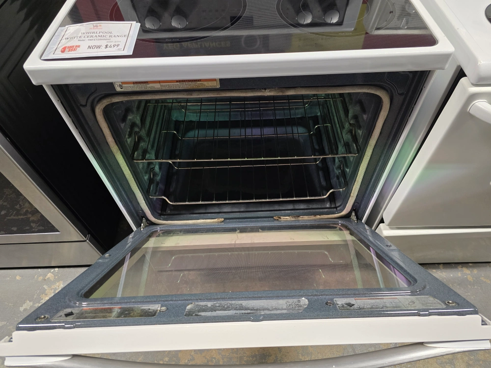 Selling a Whirlpool white electric range. It is in good condition and ready for a new home. It has a glass top and a self-cleaning oven. The range is white and has a digital display.