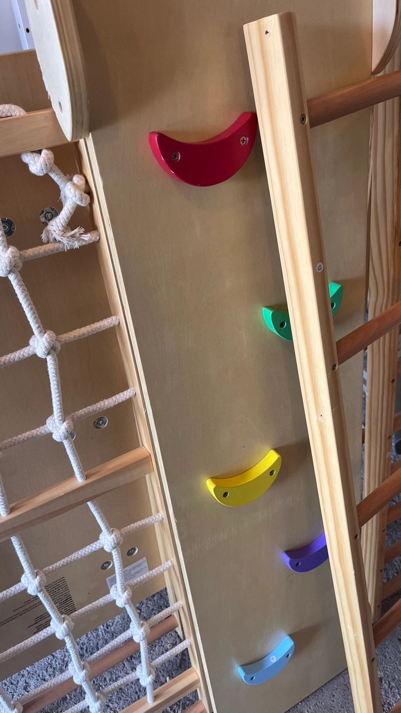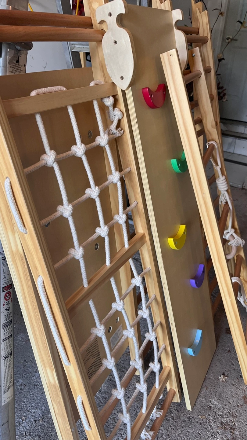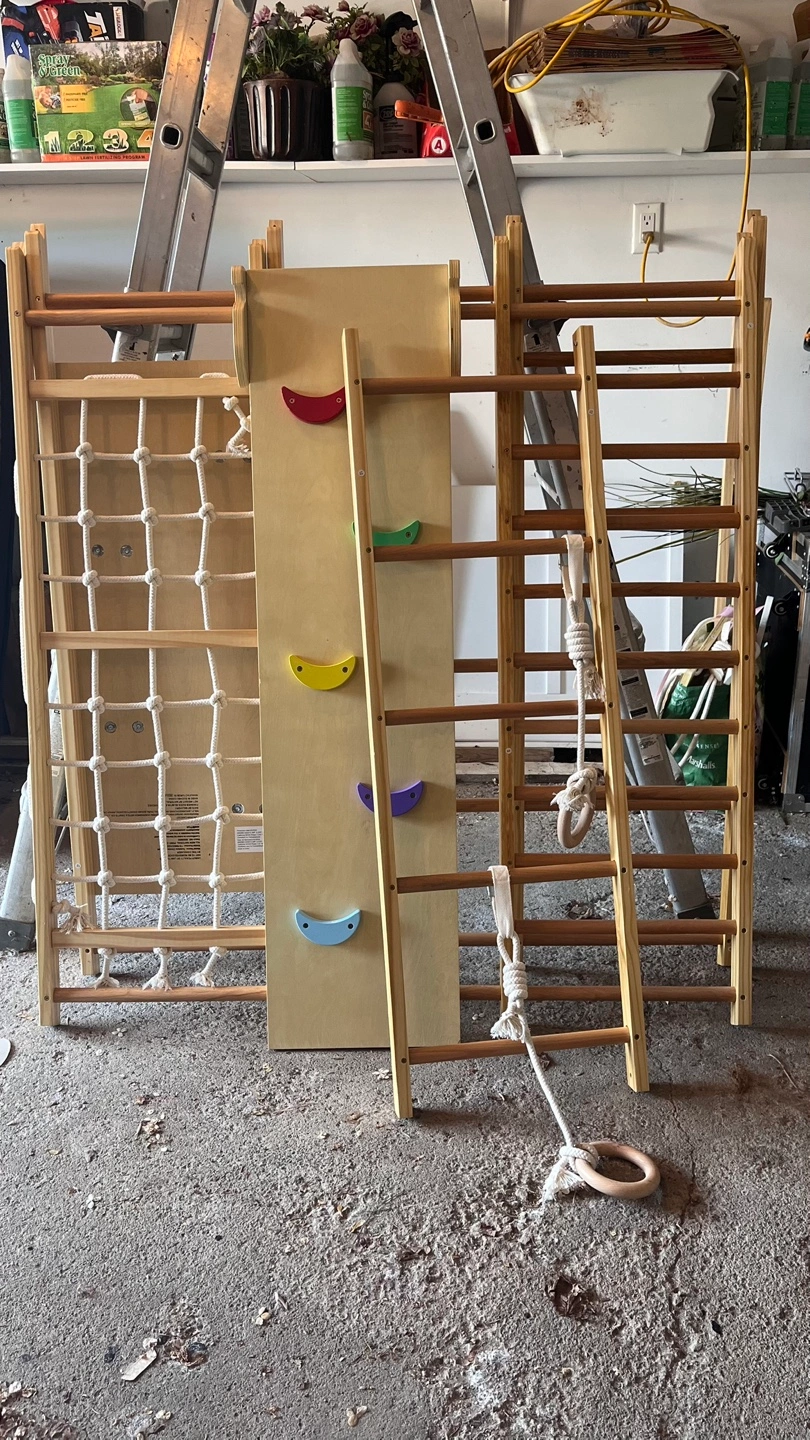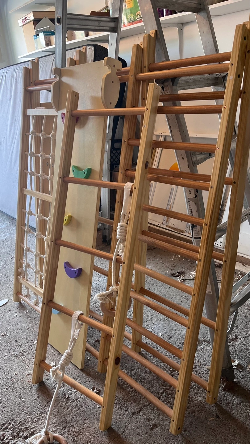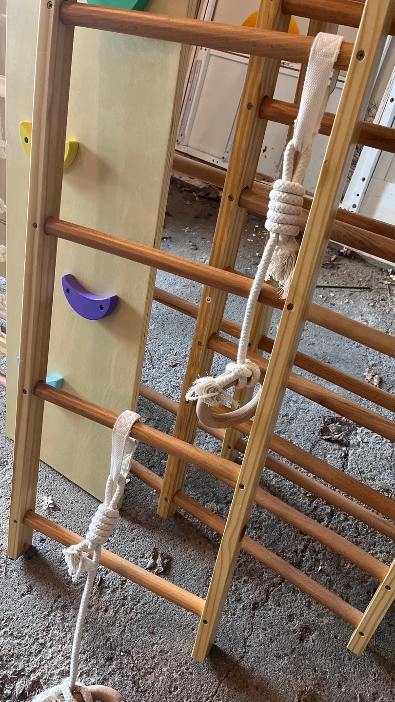 Selling a wooden climbing gym for kids! It features a climbing wall with colourful holds, a rope ladder, and other fun climbing elements. Perfect for active play and developing coordination skills.