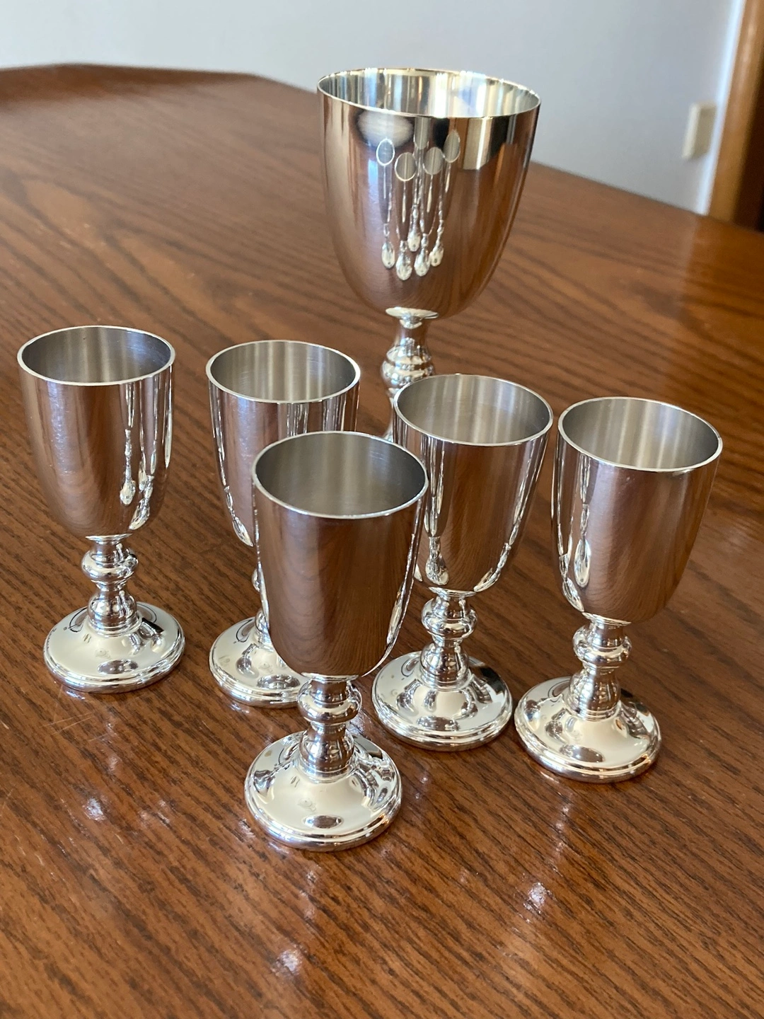 2 sets of 6 vintage silver-plated wine 🍷 goblets and 1 set of 5 liquor cups. Elegant design, perfect for serving or display. $50/ set