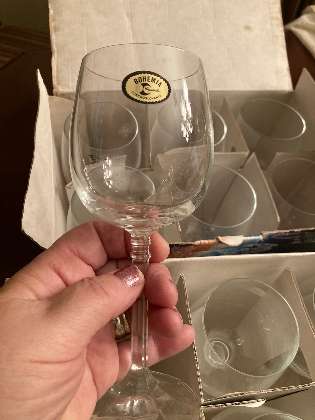 Selling two sets of Bohemia Isabelle wine glasses. They come in their original box. These glasses would be perfect for any occasion!