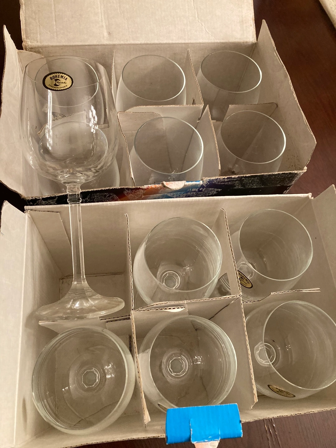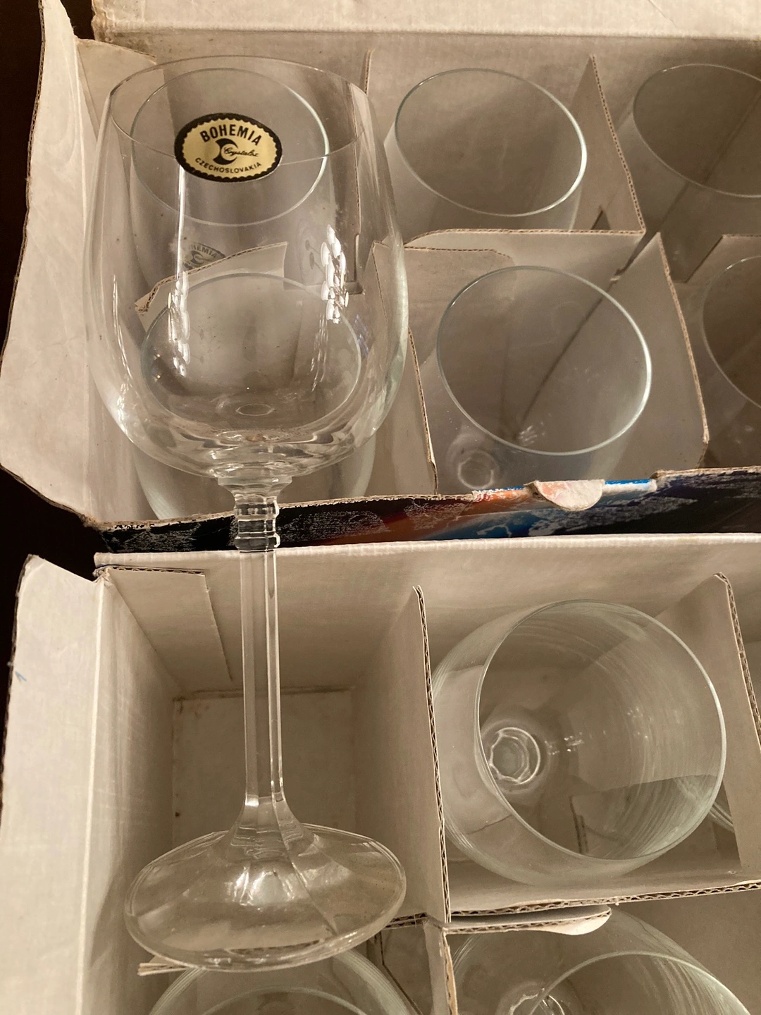 Selling two sets of Bohemia Isabelle wine glasses. They come in their original box. These glasses would be perfect for any occasion!