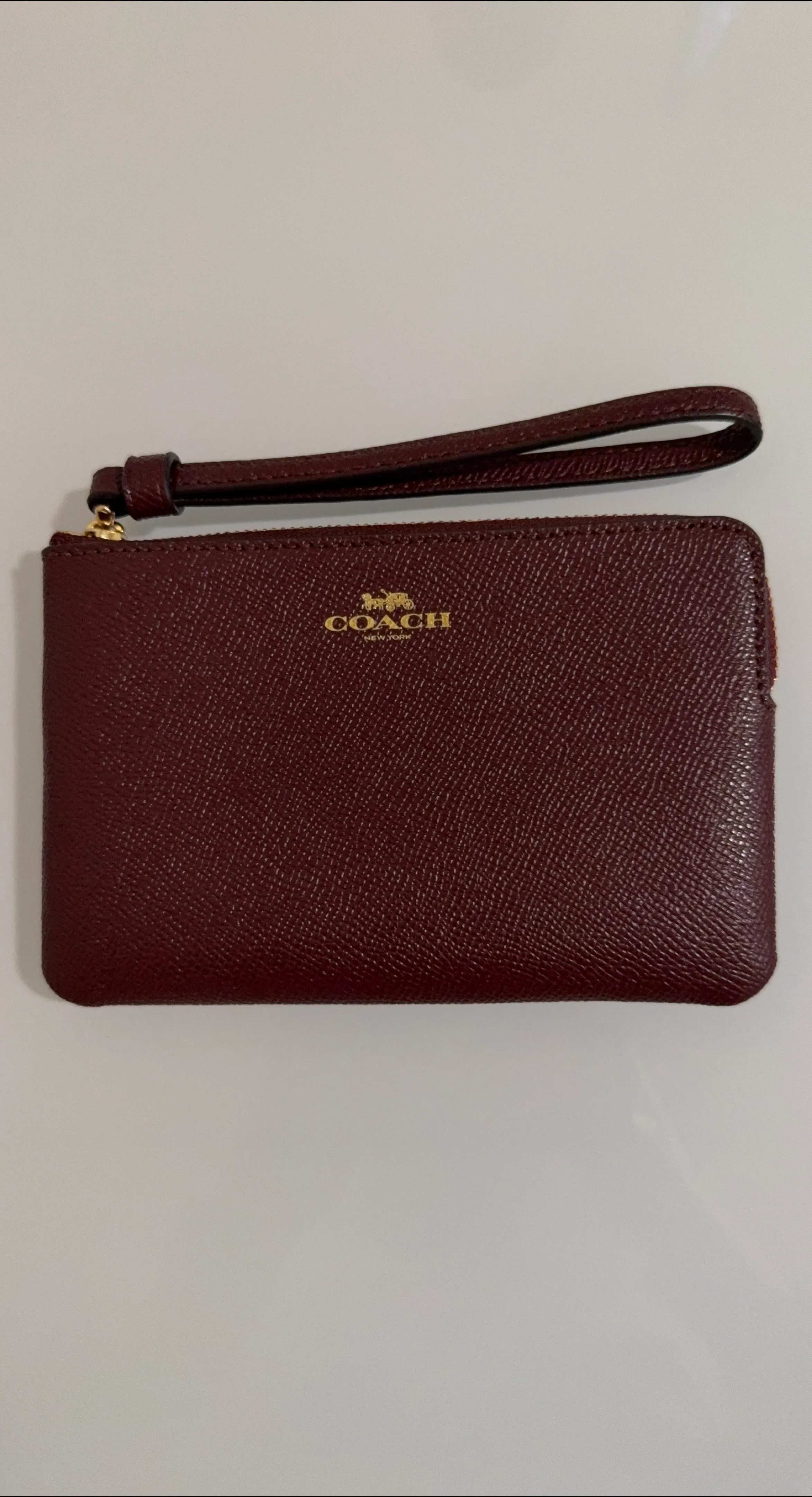Selling a Coach wristlet in great condition! It's a stylish and compact accessory, perfect for carrying your essentials. The wristlet features a zip closure and a convenient wrist strap. It's a beautiful burgundy color and has the classic Coach logo.