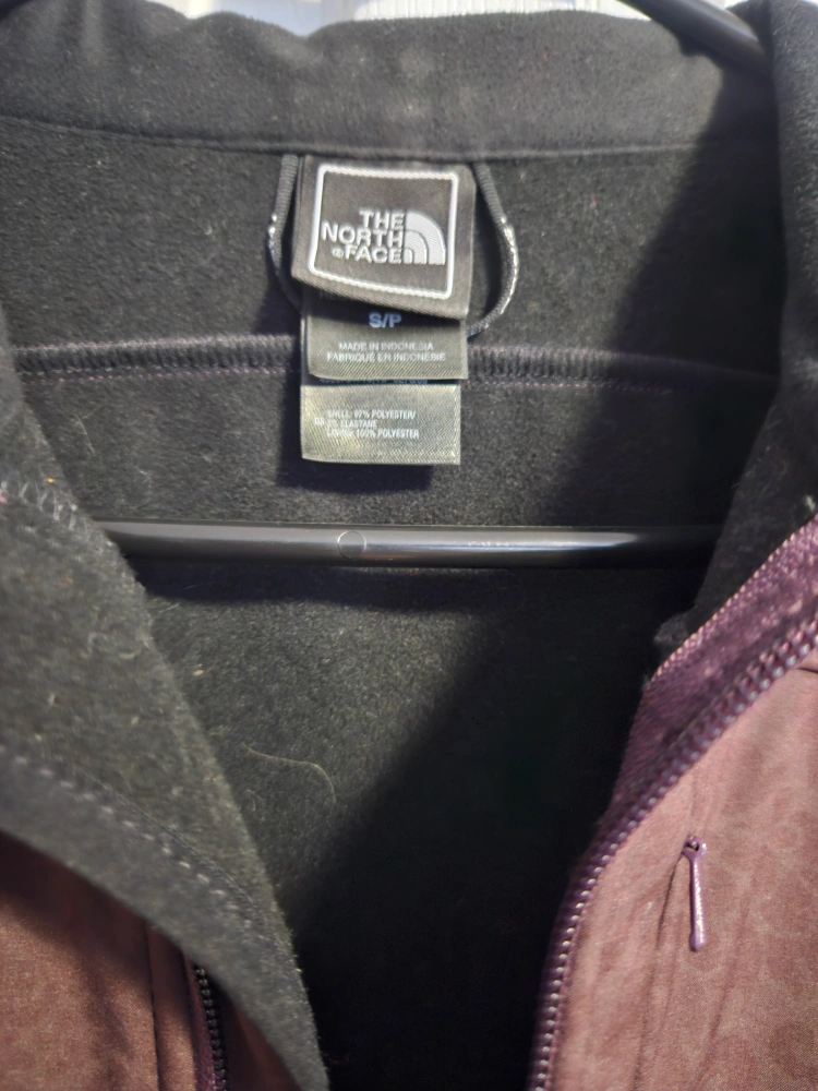 This is a The North Face softshell jacket in size small. It's in great condition and ready for a new home. The jacket is a stylish plum colour with a subtle pattern. Perfect for layering or wearing on its own during milder weather!