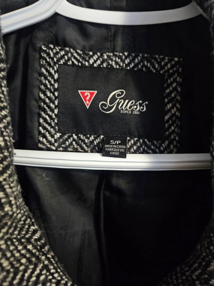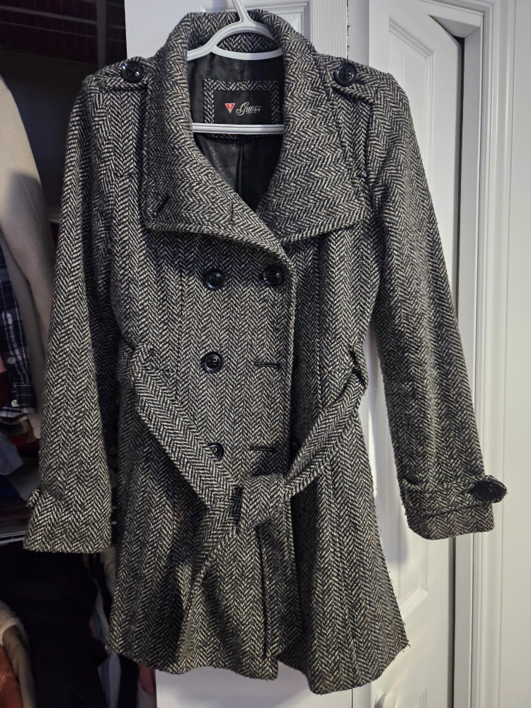 Selling a stylish Guess trench coat in a classic herringbone pattern. It's a size small and made from a wool blend, perfect for staying warm and fashionable. The coat features a double-breasted design with button closures and a belted waist to cinch in the silhouette. Great for layering during the colder months!