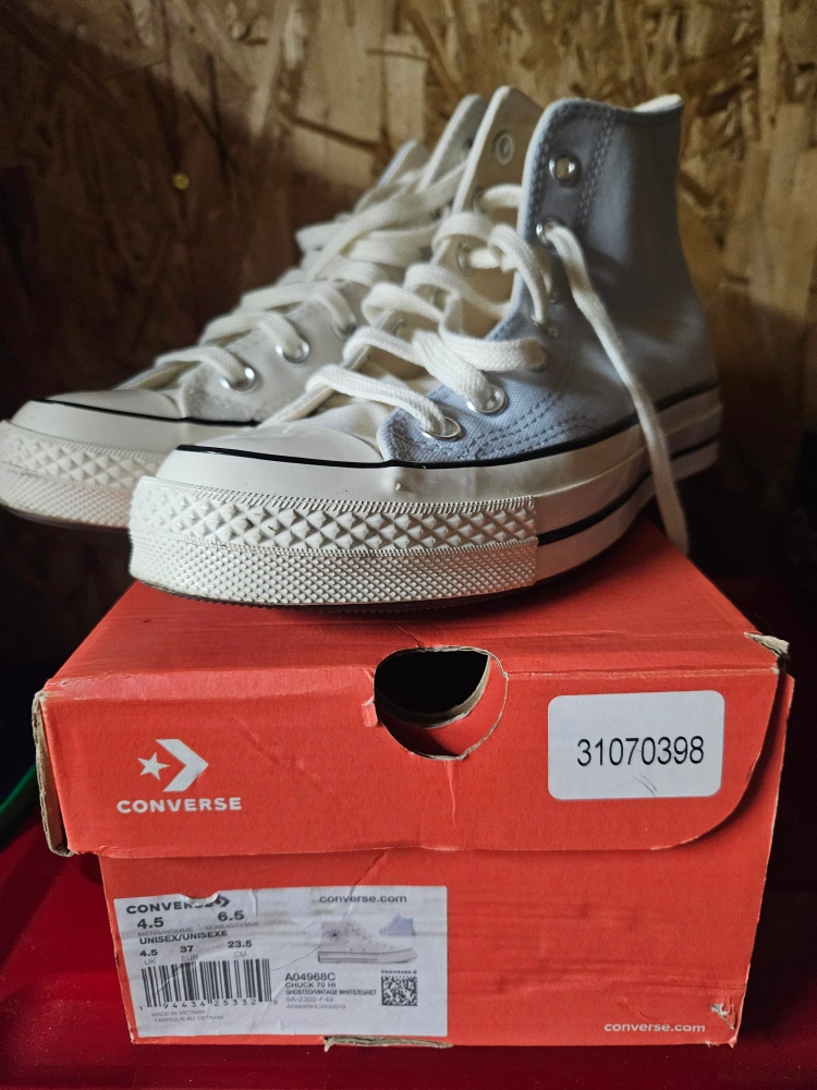 Selling a pair of Converse Chuck 70 High Tops in size 4.5. They are in great condition , used a couple of times and come with the original box! Perfect for adding a classic touch to your wardrobe