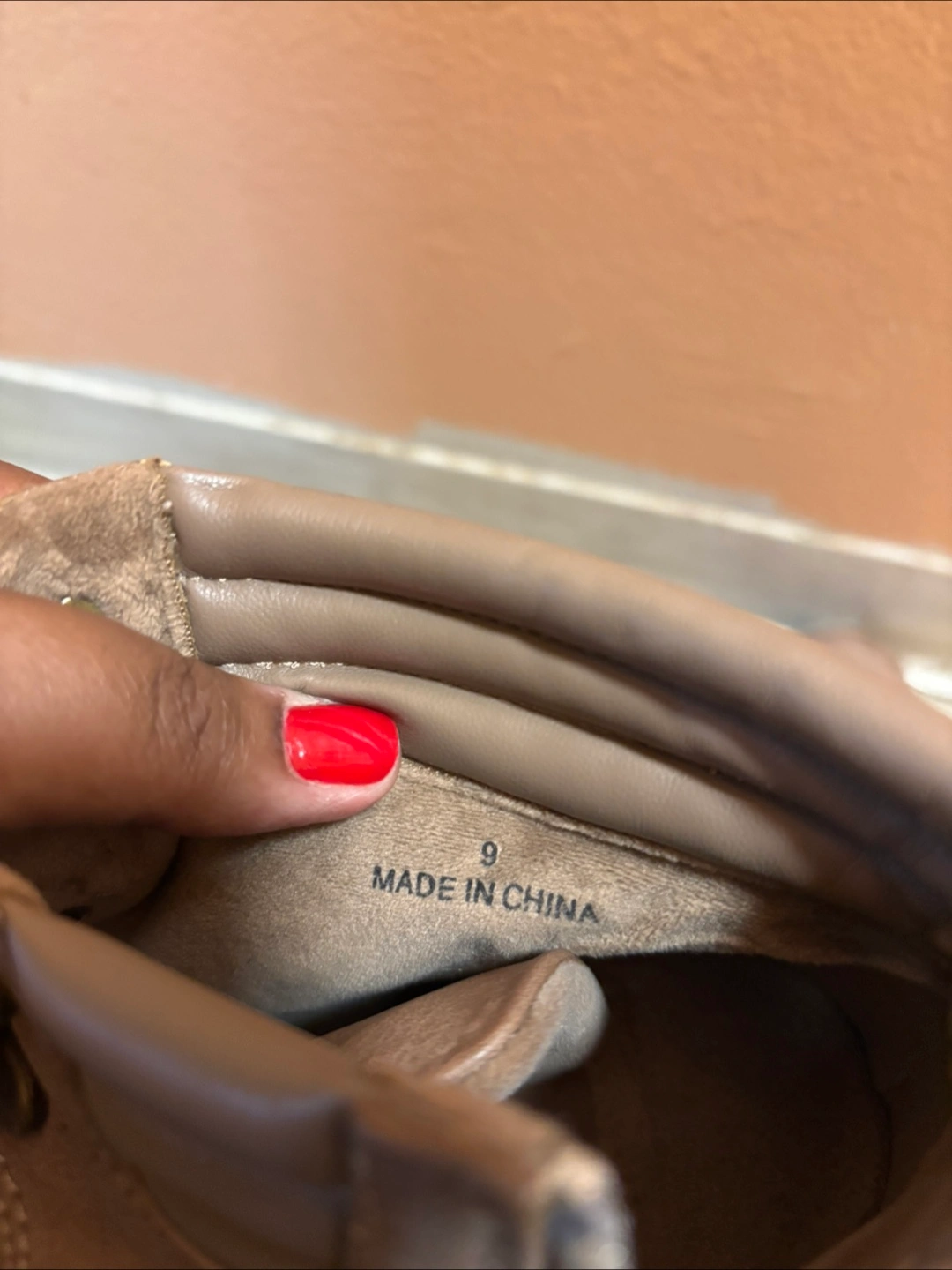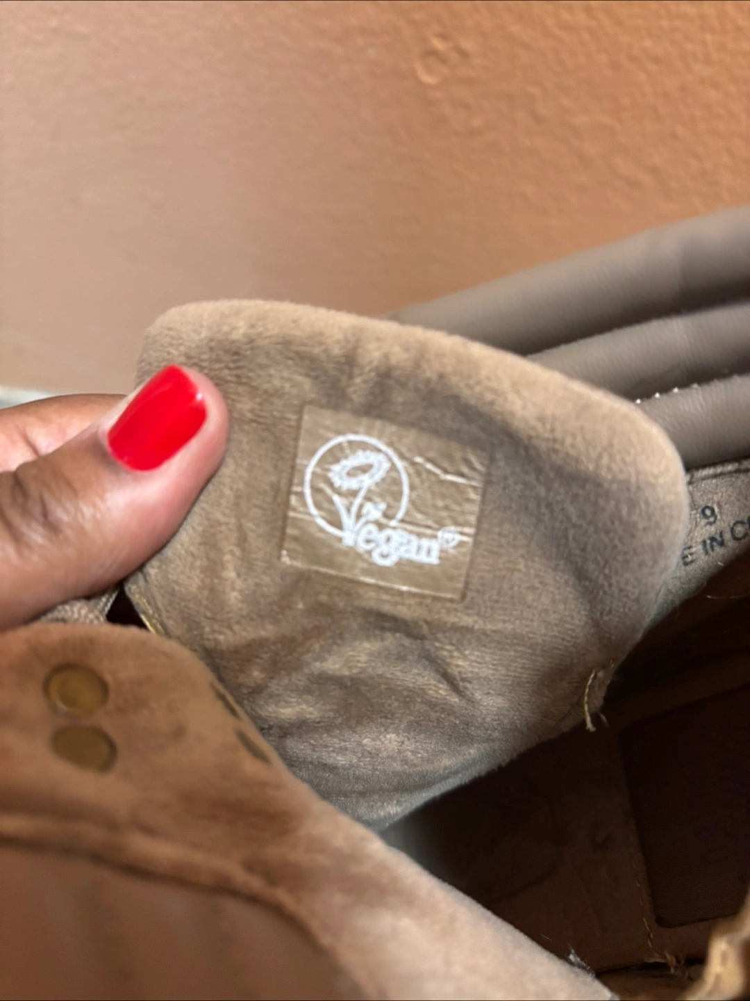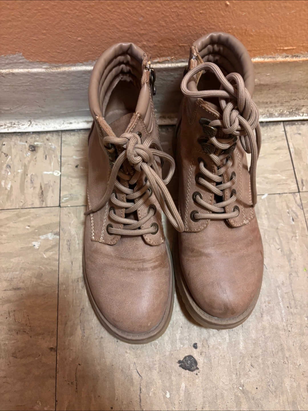 Selling a pair of ankle boots in a neutral brown color! They're a size 9 and have a lace-up front with a side zipper for easy on and off. These boots show some signs of wear but still have plenty of life left in them! Made with Vegan material.