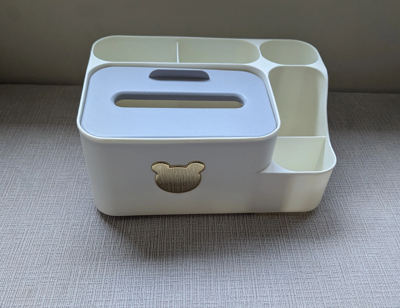 614Here's a handy tissue box cover with a built-in organizer! It's perfect for keeping your desk or vanity tidy. The organizer has multiple compartments for pens, makeup brushes, or other small items. The design features a cute bear detail, adding a touch of charm to any space