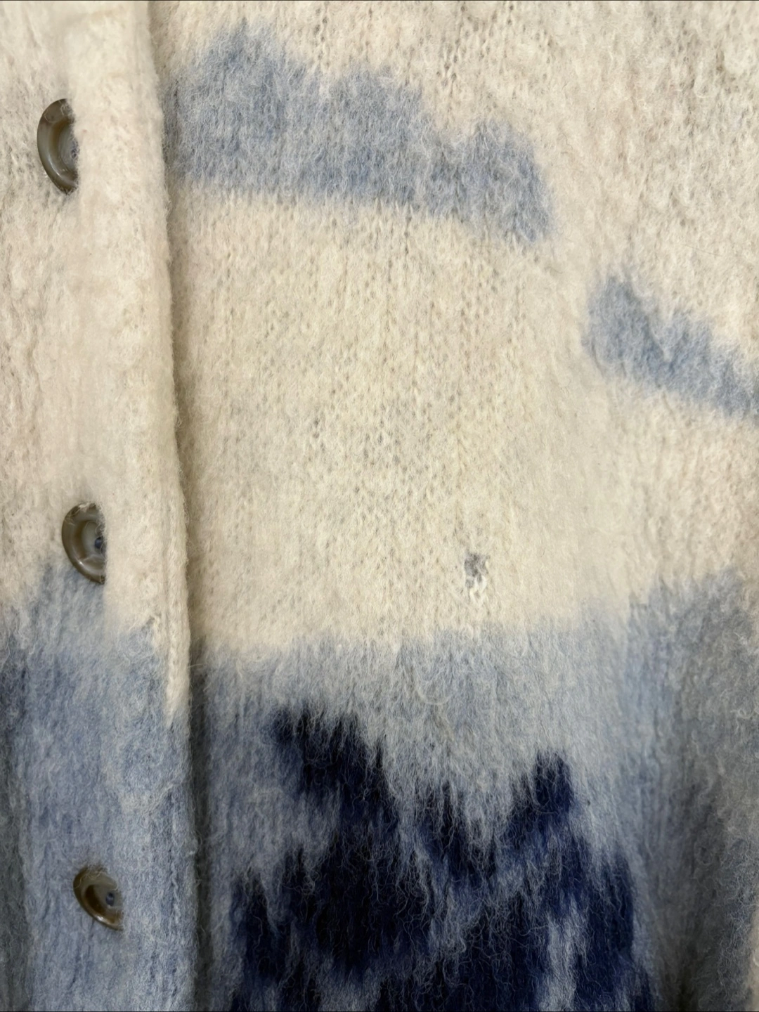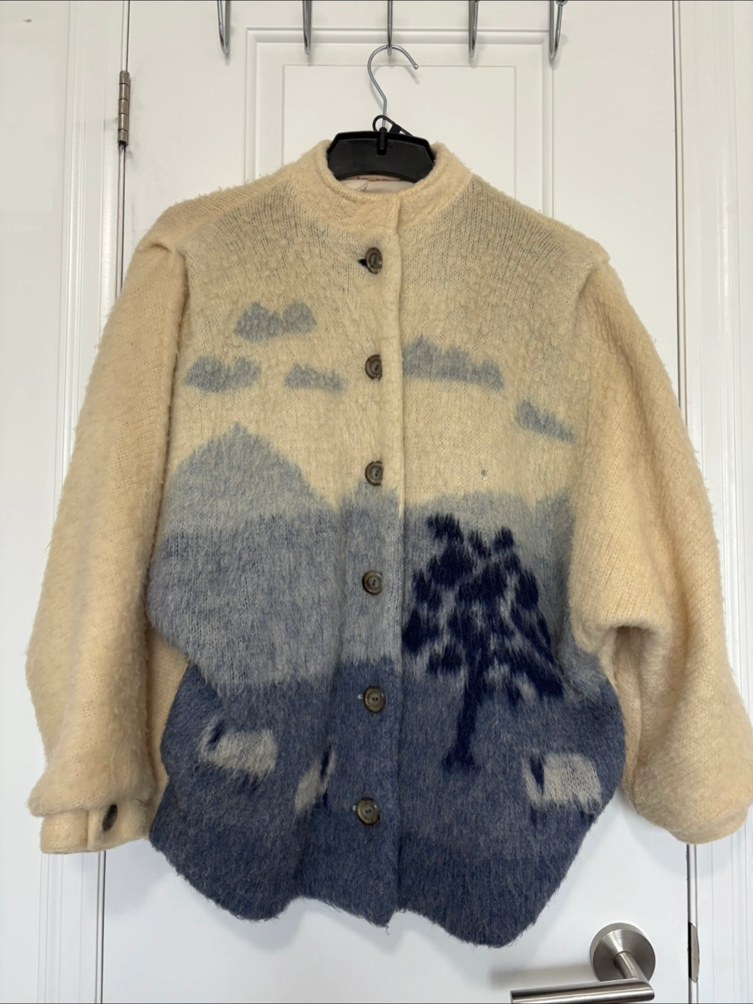Cozy up with this unique Icelandic wool coat perfect for fall! It features a landscape design in cream and blue tones. It is made of pure wool and has a comfortable, relaxed fit. I’d say it’s a size large or XL and looks great oversized. See photo of one small hole that can be darned/ mended. (Reflected in the price.) Pickup near Sherbourne and Adelaide Street East.
