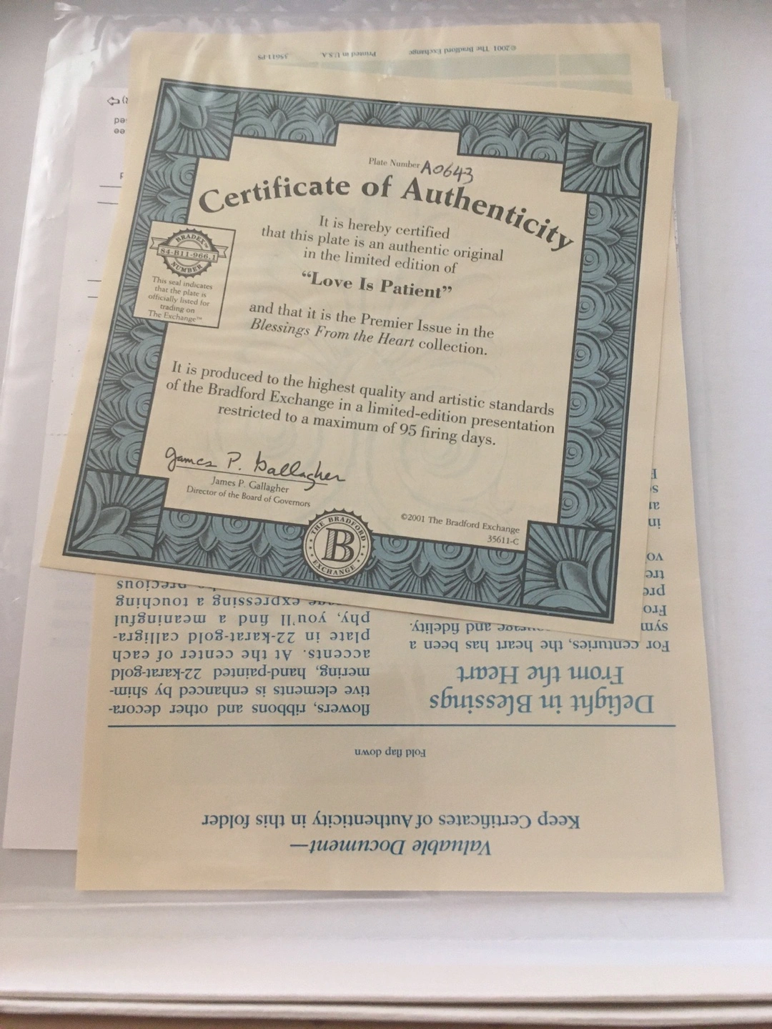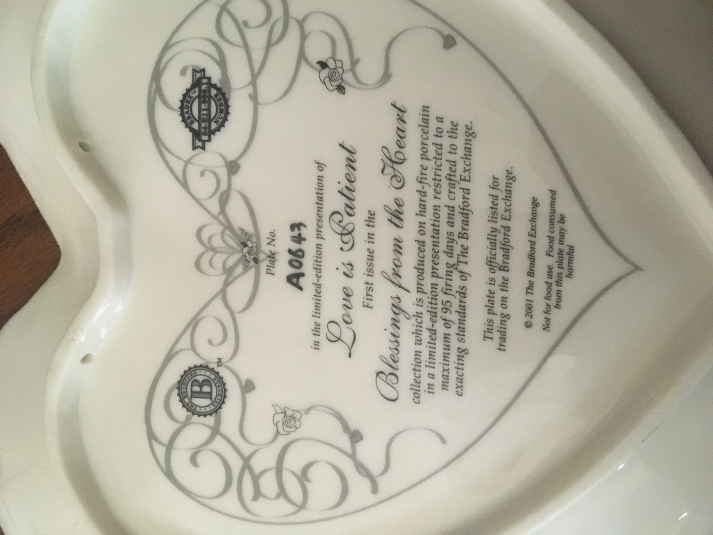 This is a beautiful heart-shaped plate from The Bradford Exchange, titled "Love is Patient". It's the first issue in the Blessings From the Heart collection. The plate is made of hard-fire porcelain with 22-karat gold accents. It comes with a Certificate of Authenticity and the original box