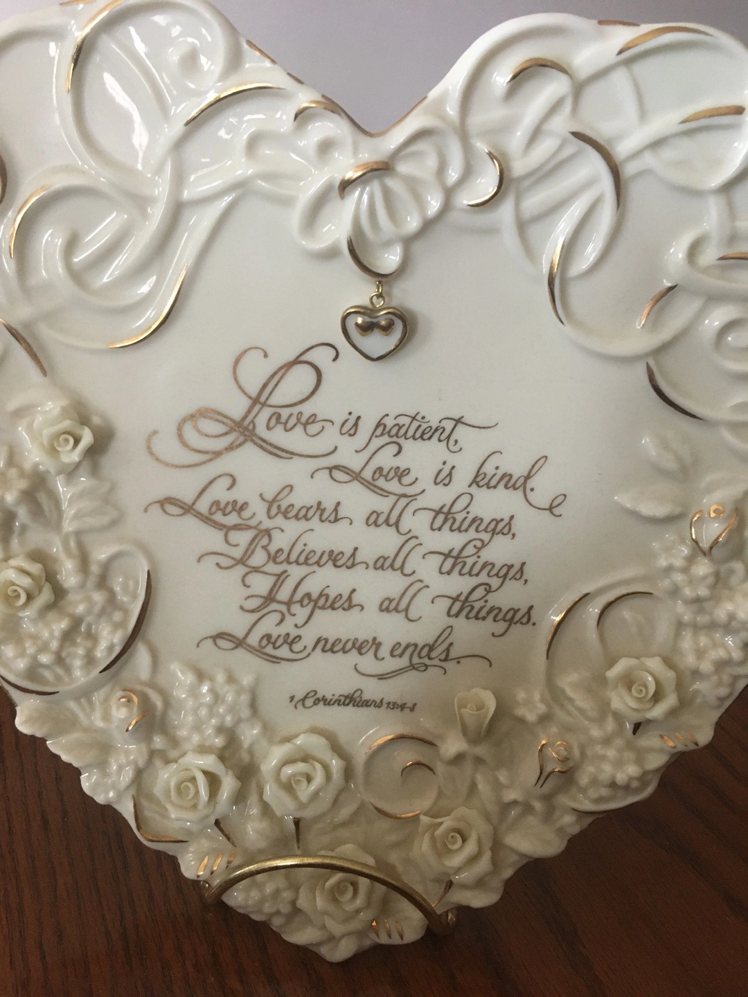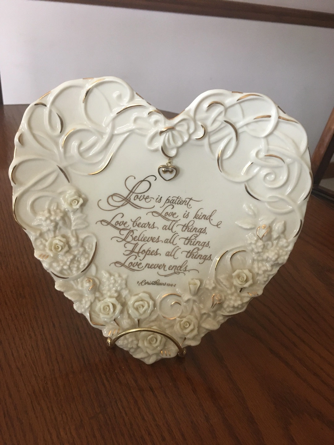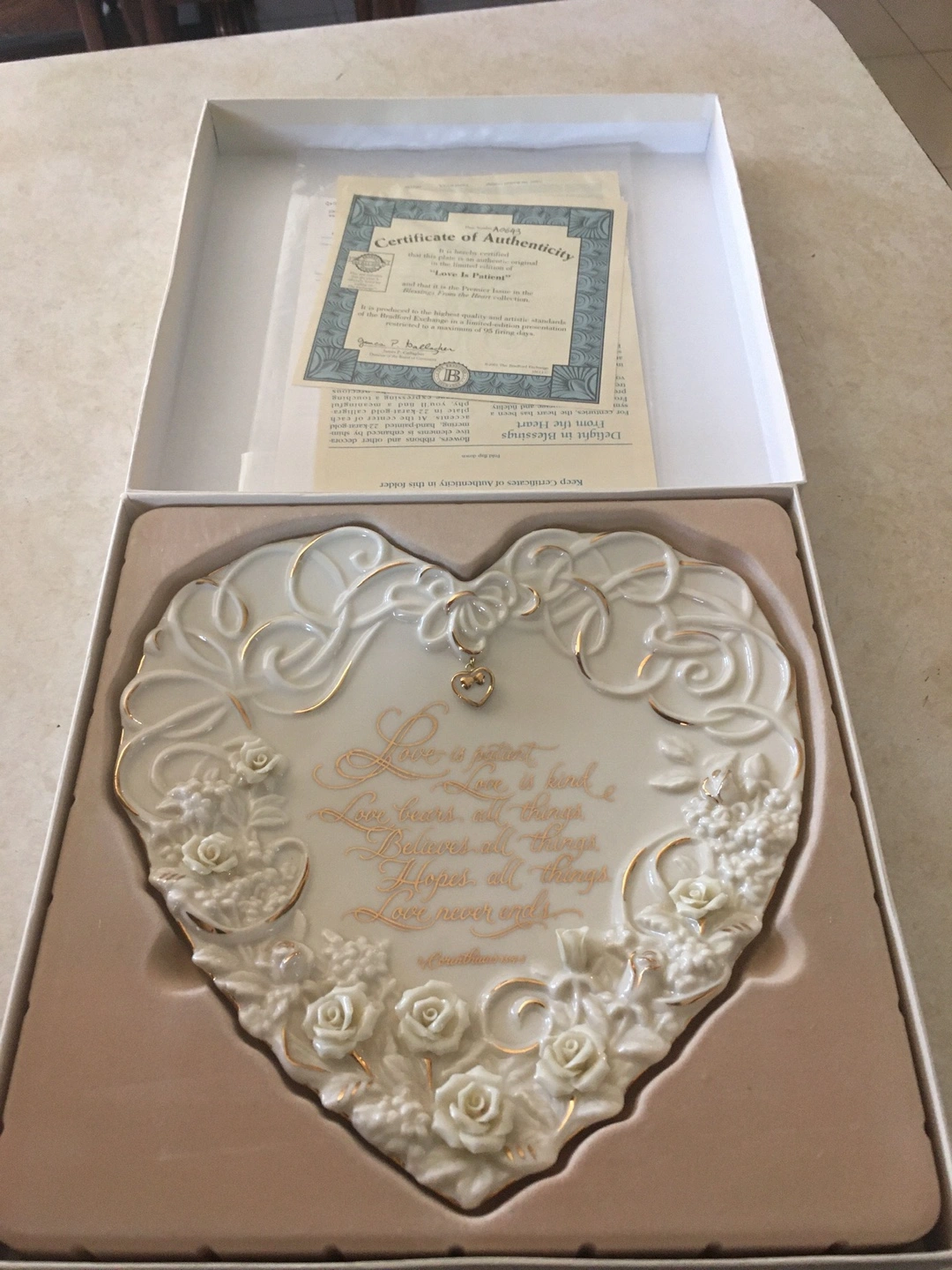 This is a beautiful heart-shaped plate from The Bradford Exchange, titled "Love is Patient". It's the first issue in the Blessings From the Heart collection. The plate is made of hard-fire porcelain with 22-karat gold accents. It comes with a Certificate of Authenticity and the original box