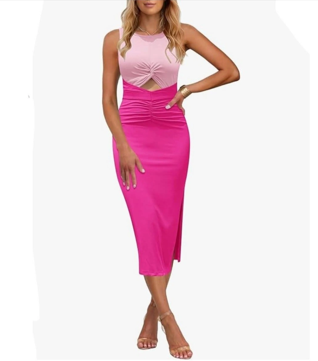 Medium-Womens Summer Bodycon Dresses Cutout Sexy Sleeveless Dress Twist Ruched Ribbed Slit Midi Dress