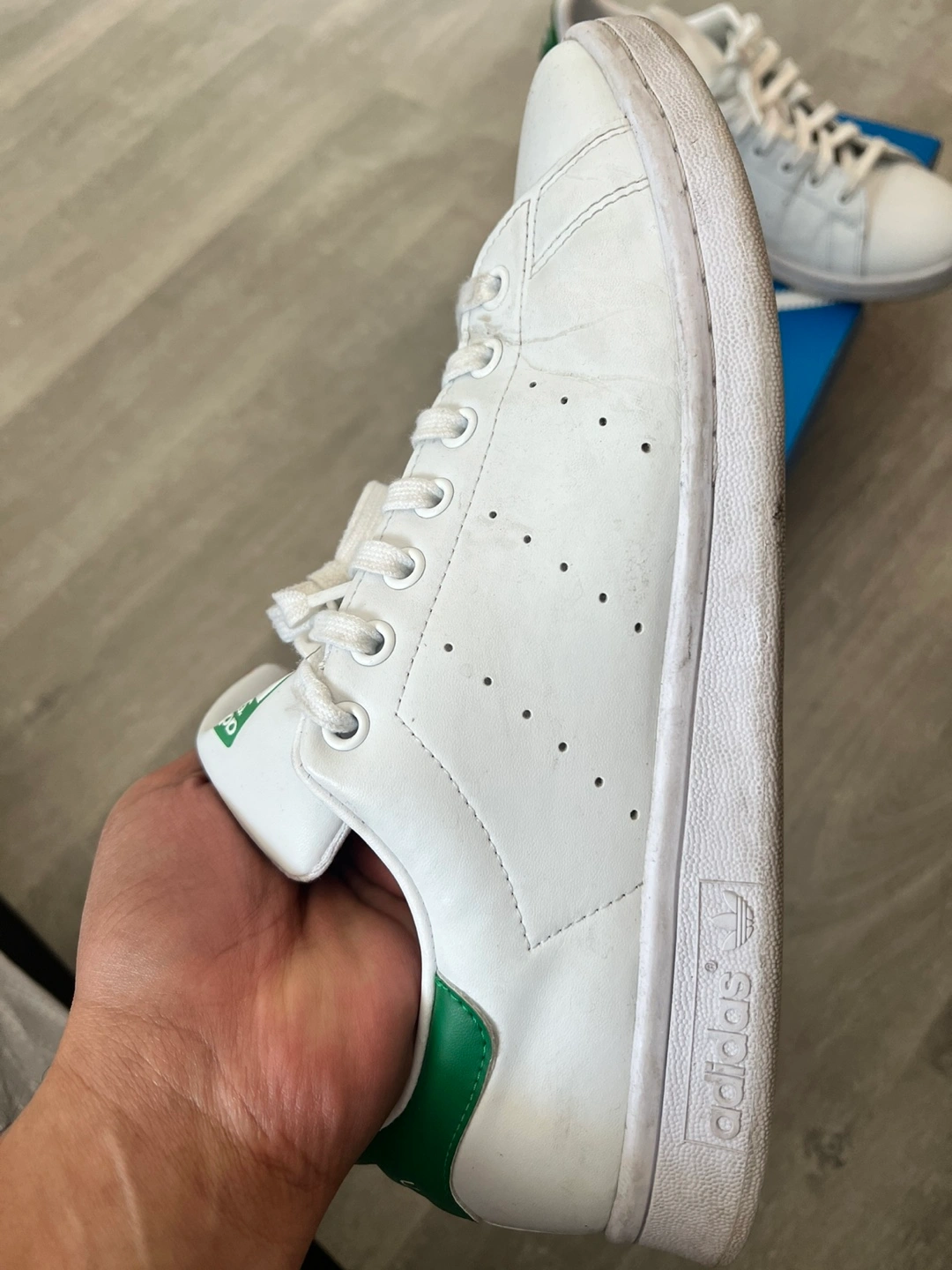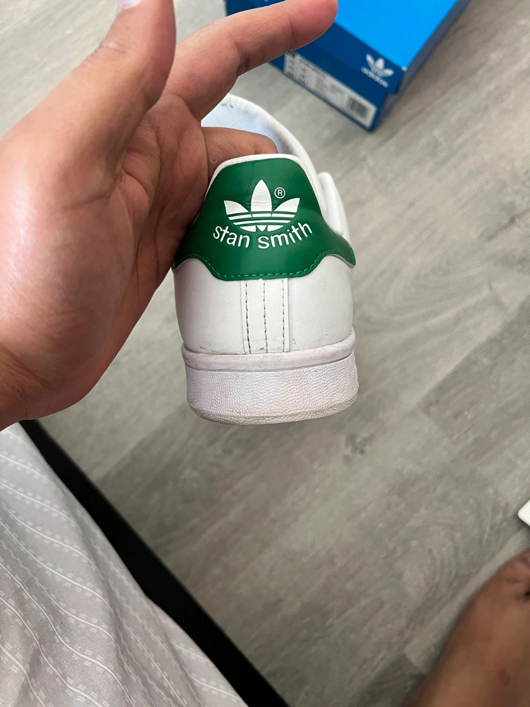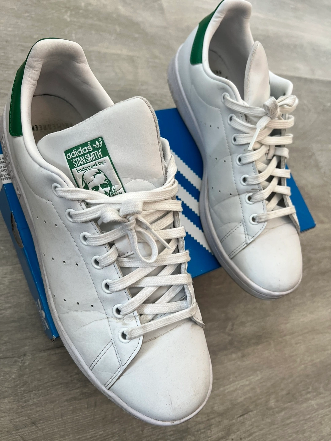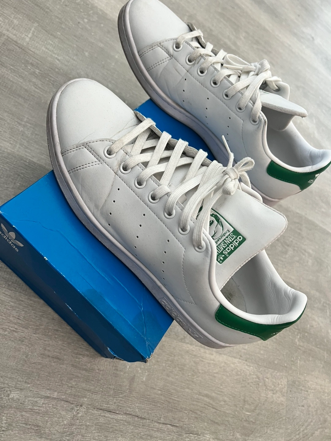 Selling a pair of Adidas Stan Smith sneakers in white and green. They come with the original box. These classic sneakers are a stylish and comfortable choice!