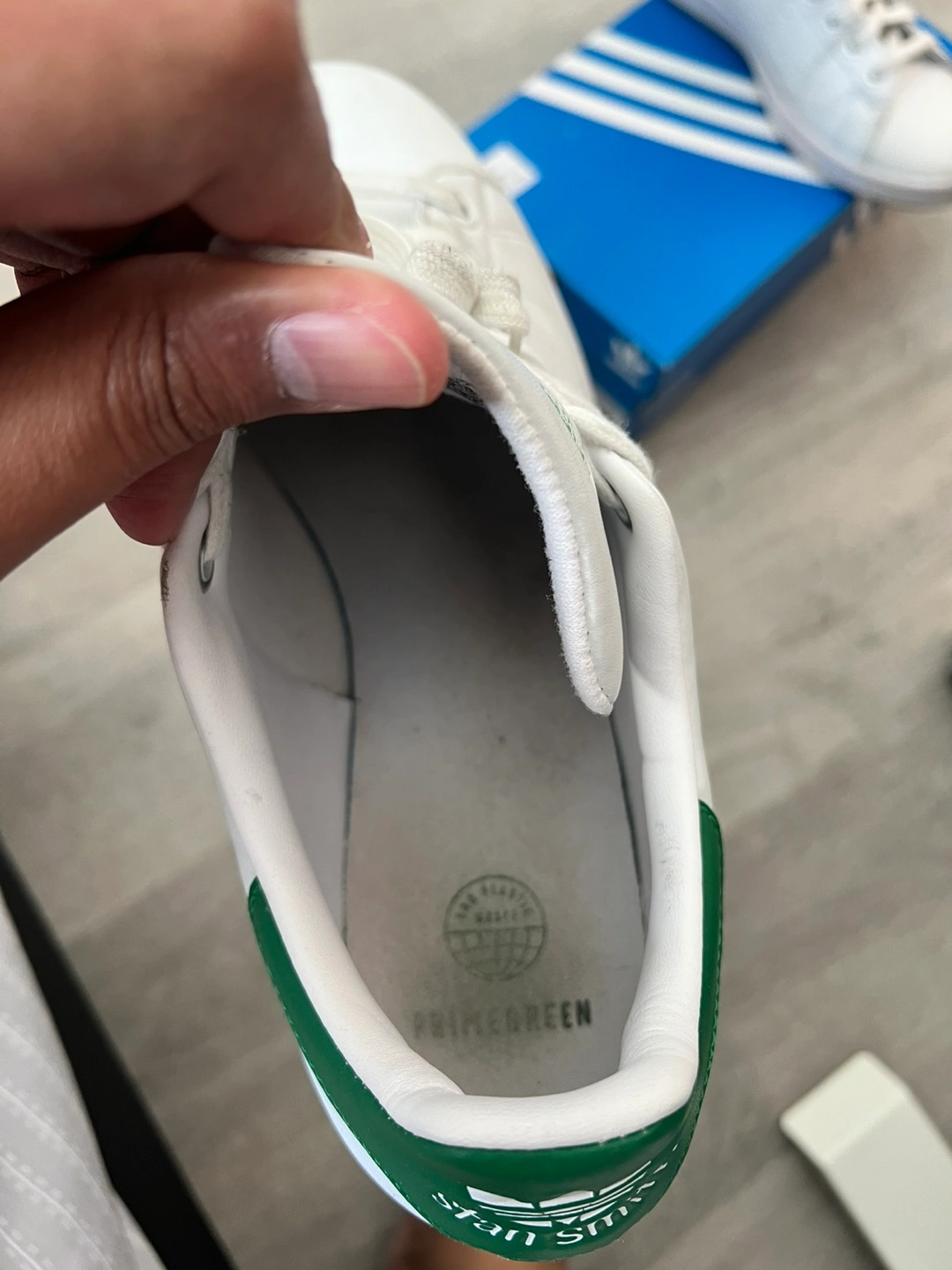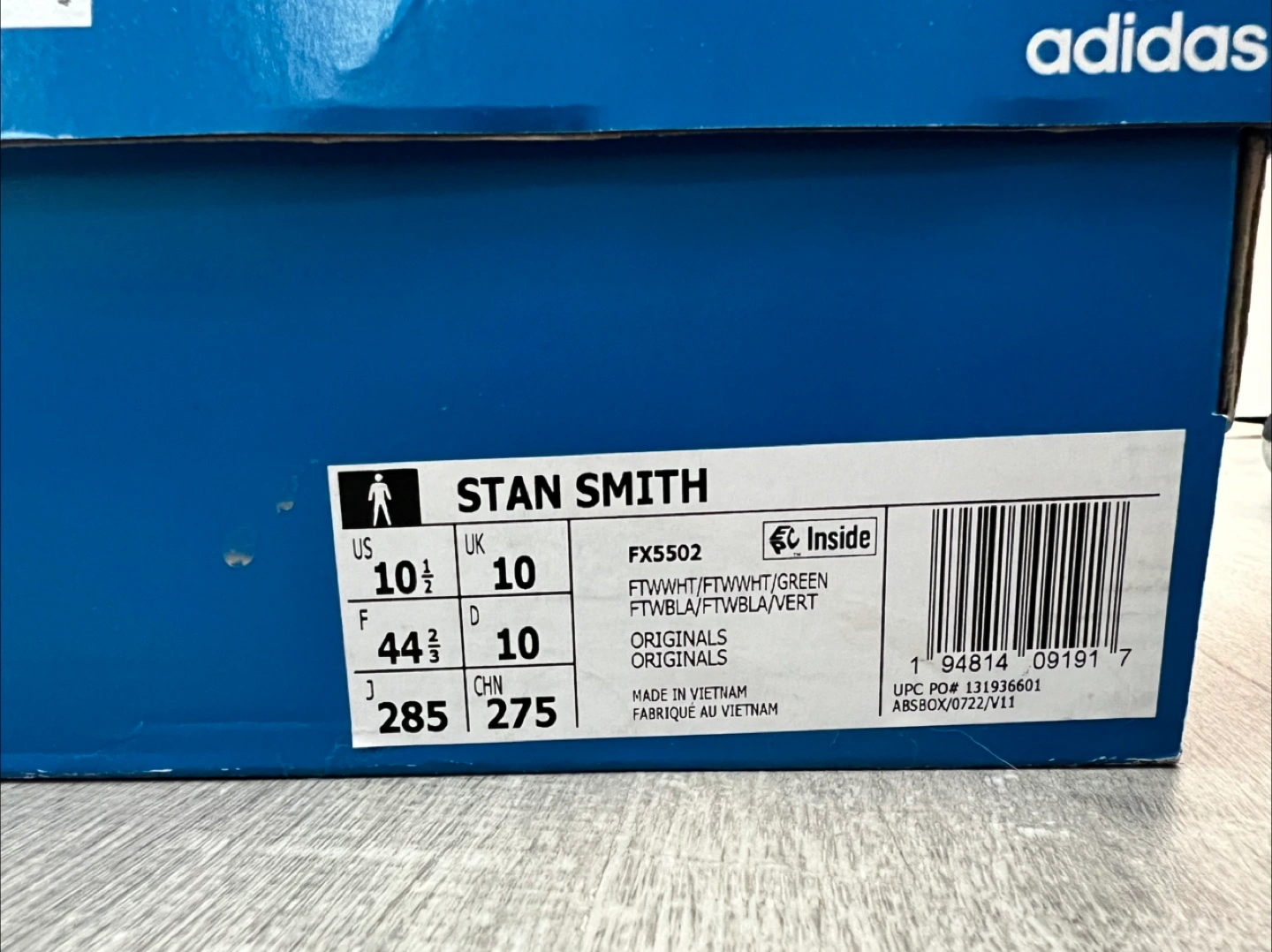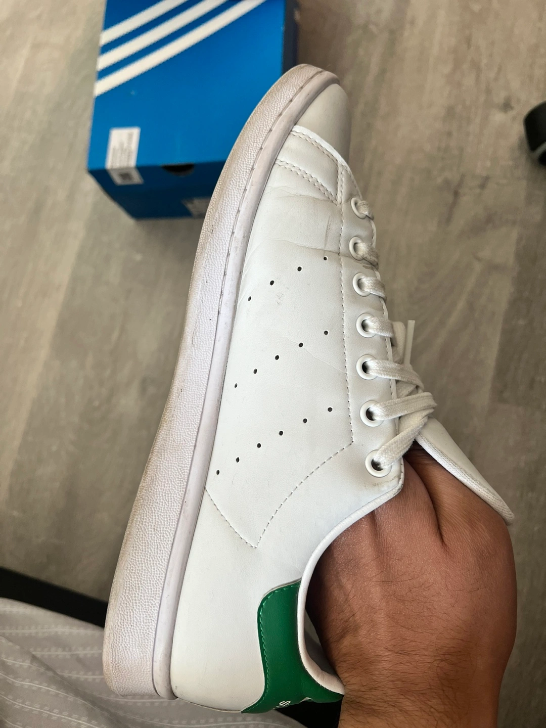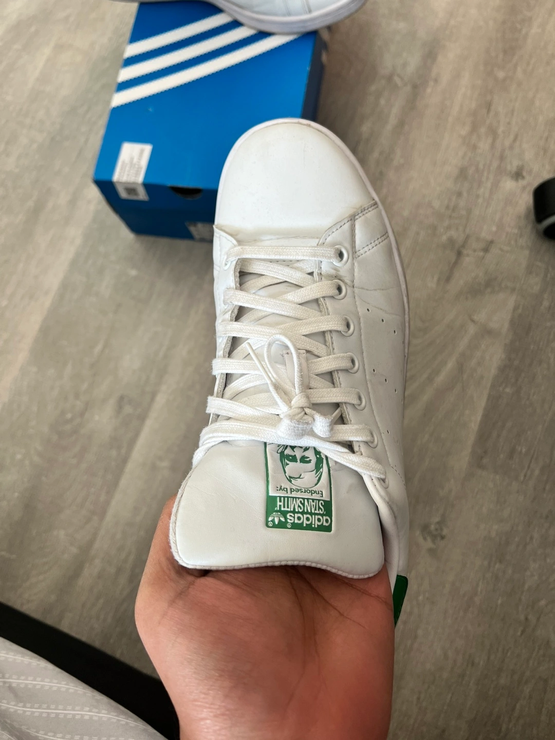 Selling a pair of Adidas Stan Smith sneakers in white and green. They come with the original box. These classic sneakers are a stylish and comfortable choice!