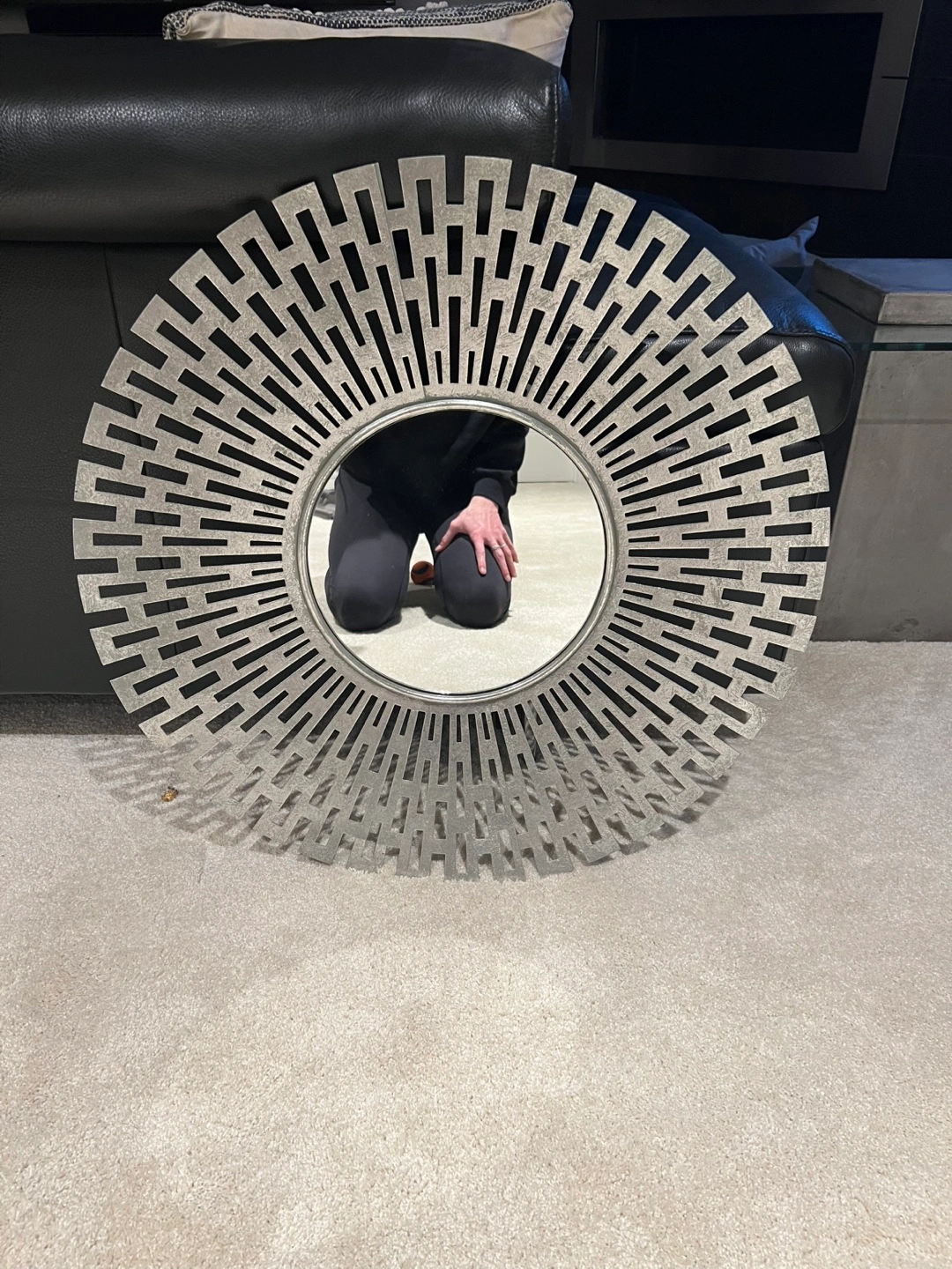 Selling a decorative round wall mirror. It's in great shape and would look lovely in any room. It has a unique design that adds a touch of modern flair to your home decor. Perfect for adding a stylish accent to your living room, bedroom, or entryway
